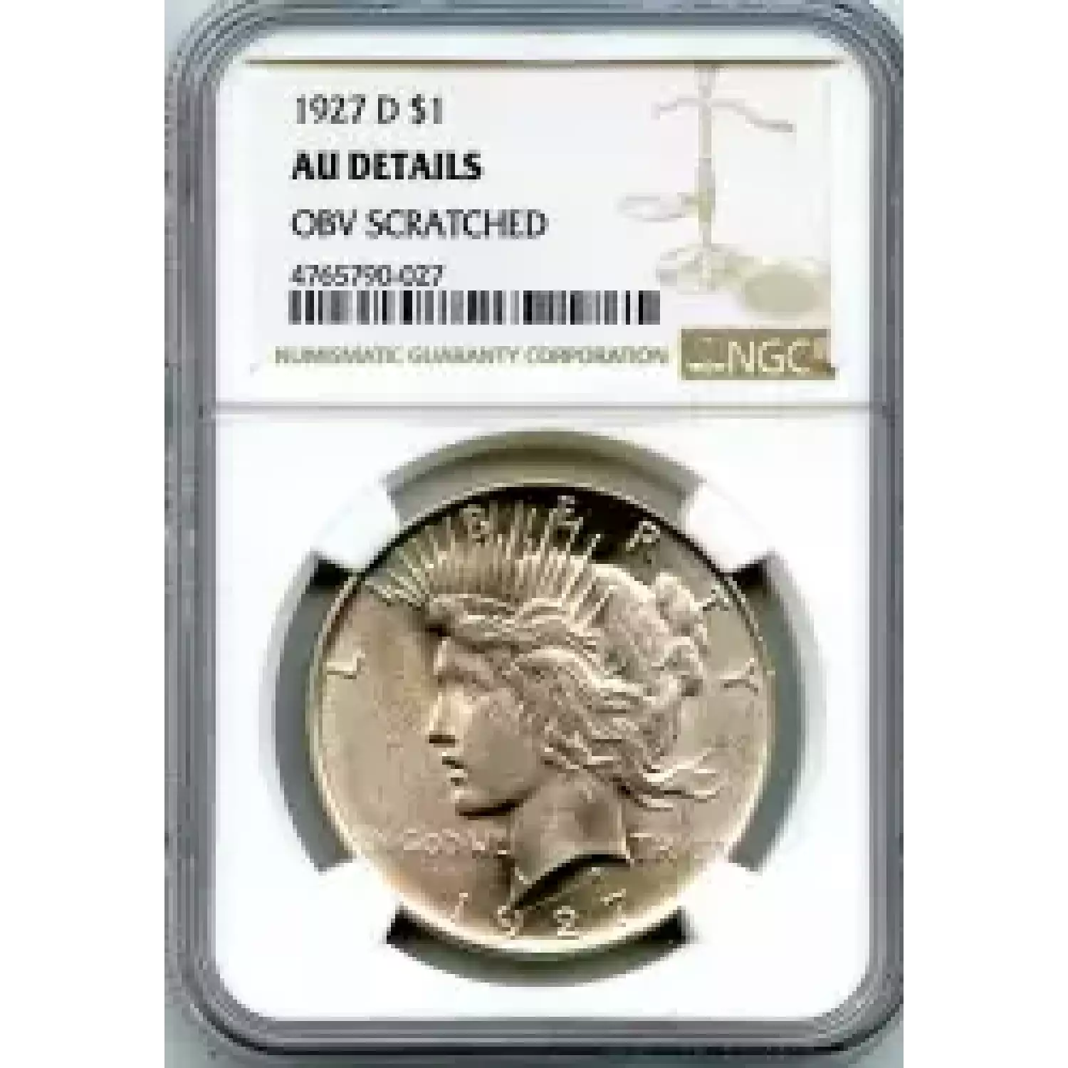 505666 | 1927-AU Details Peace Silver Dollar NGC AU Details | NGC | AU Details | Sold: 06/08/2011 | $50 |