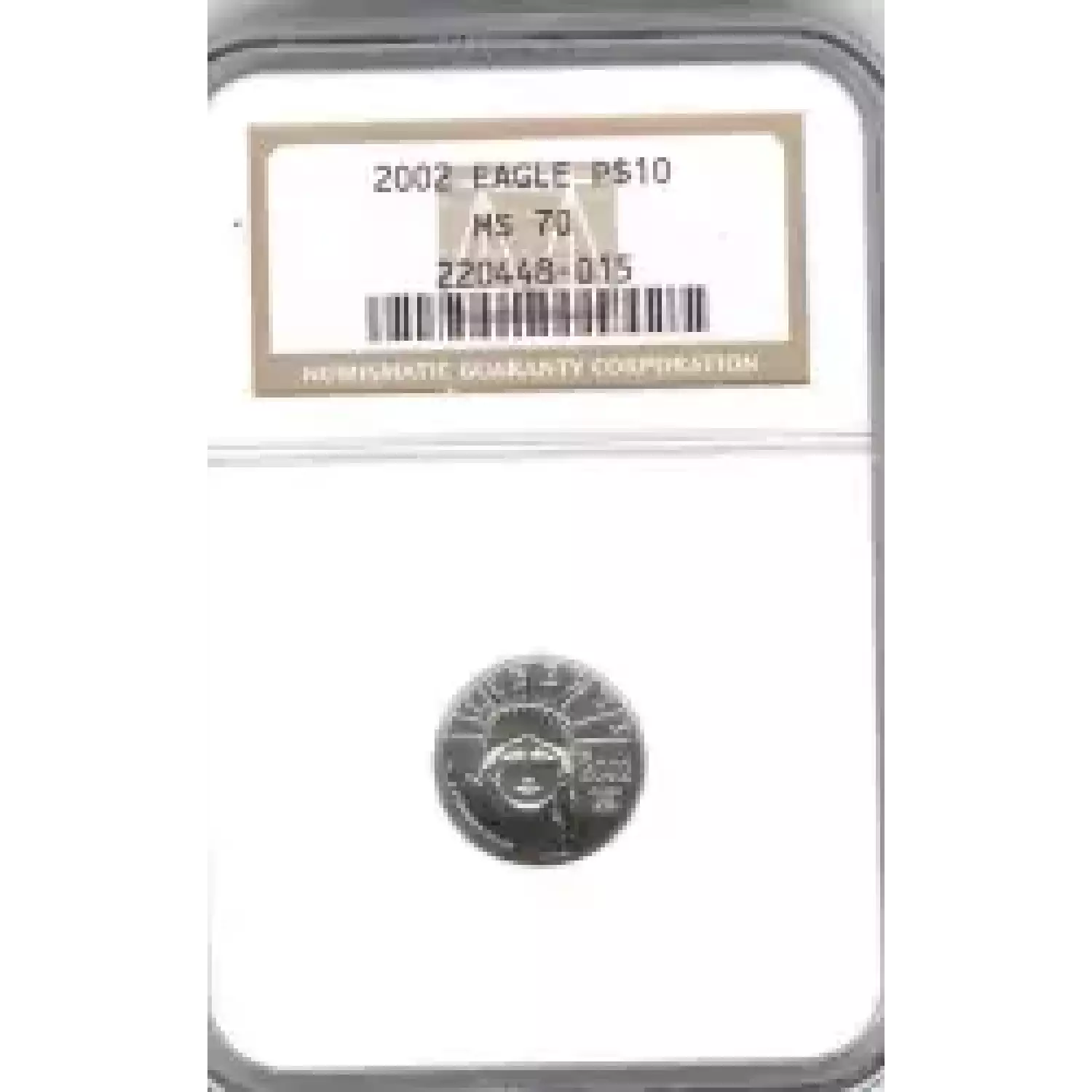 503669 | 2002-MS-70 1/10 oz $10 Platinum Eagle NGC MS-70 | NGC | MS-70 | Sold: 24/06/2006 | $249.99 |