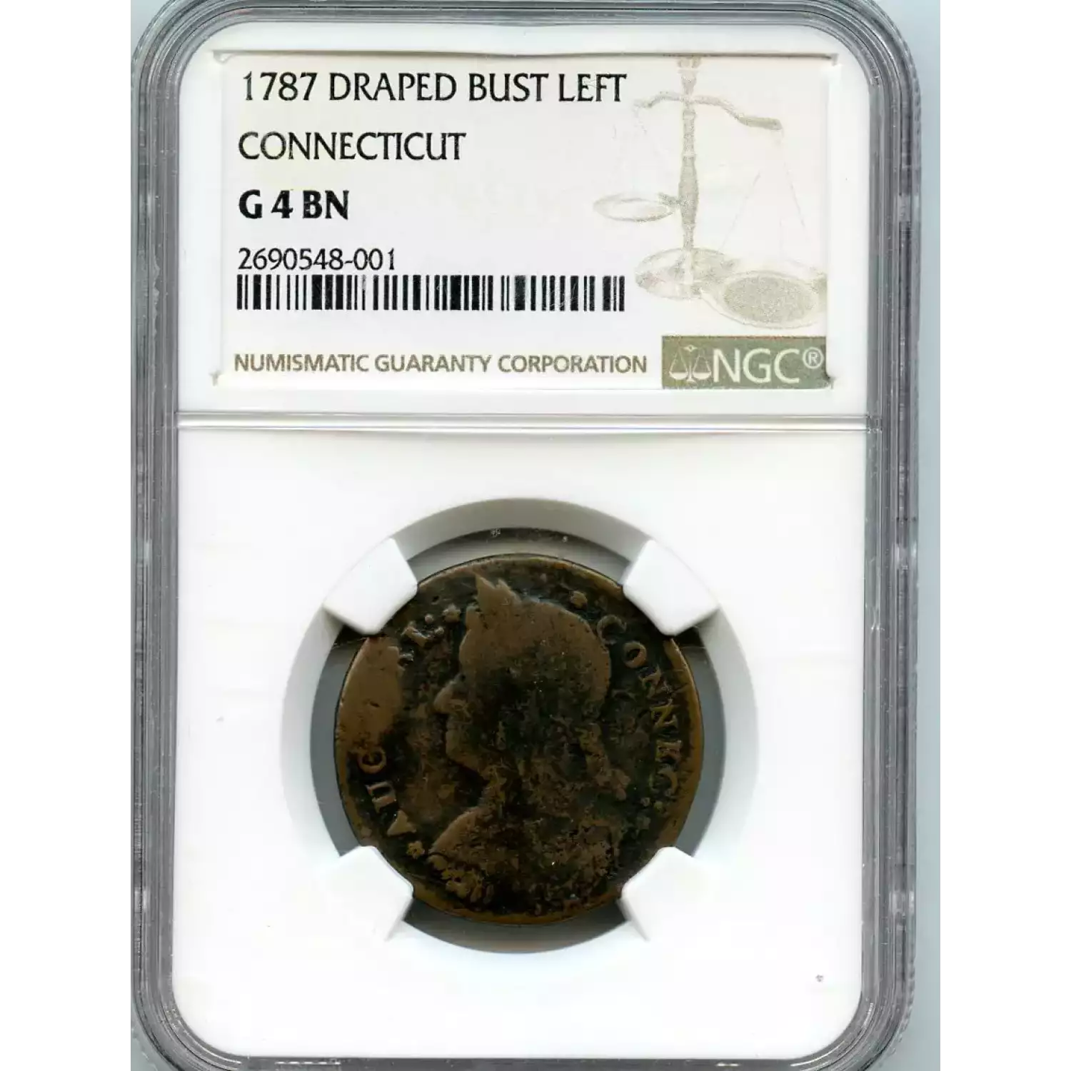 510855 | 1787-G-4 Post Colonial Issues Connecticut - Copper NGC G-4 BN | NGC | G-4 | Sold: 21/05/2018 | $135 |