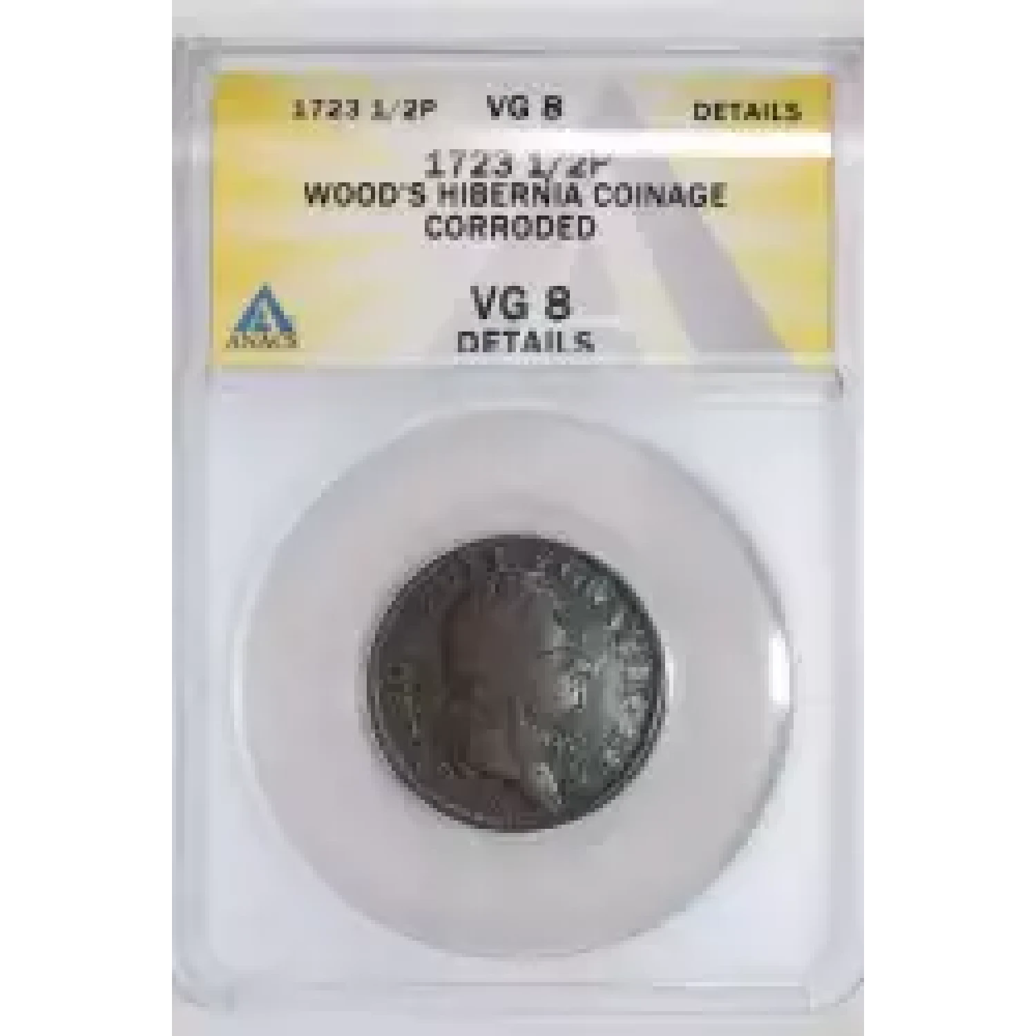 502608 | 1723 Colonial Wood’s Hibernia Halfpenny ANACS VG-8 | ANACS | VG-8 | Sold: 09/03/2023 | $175 |