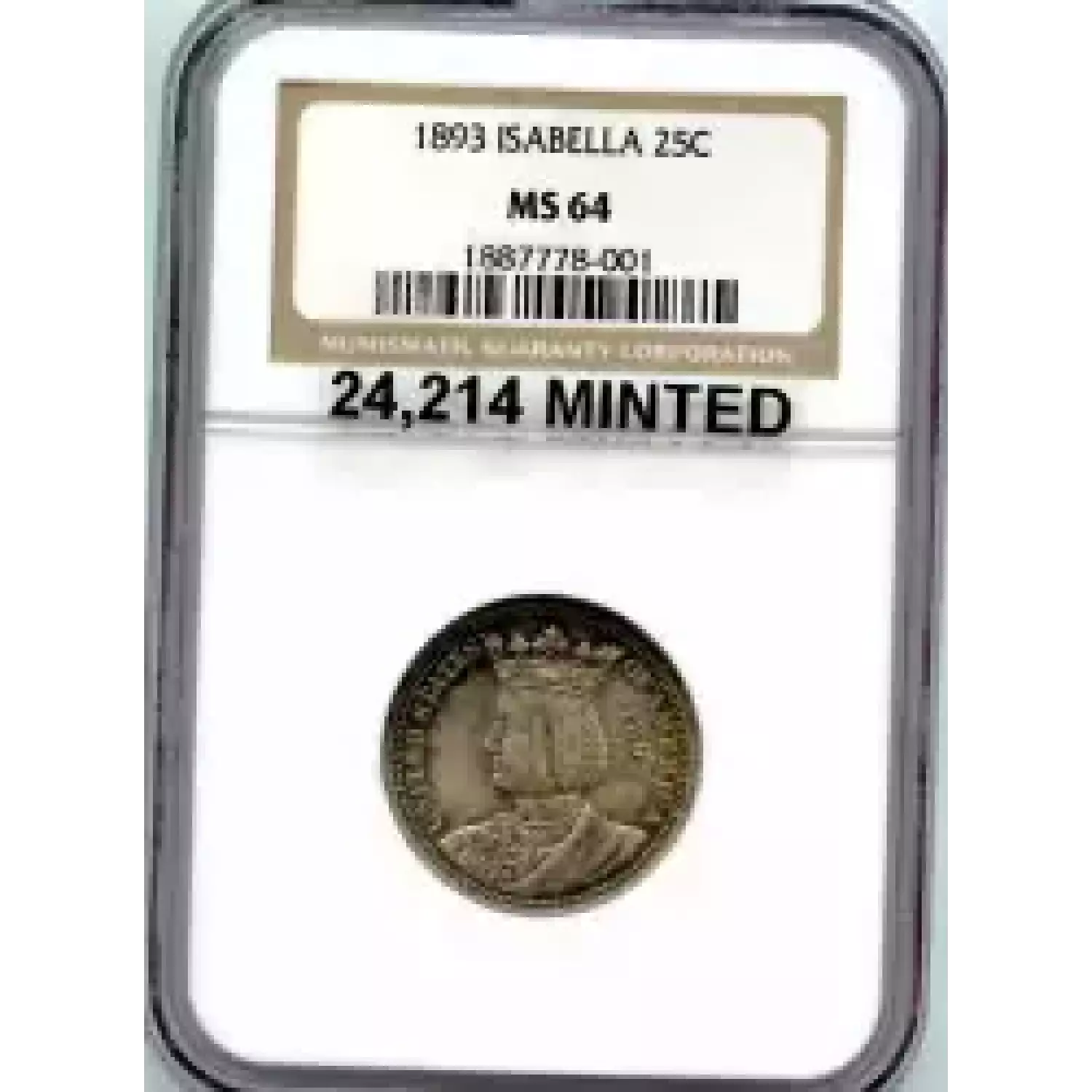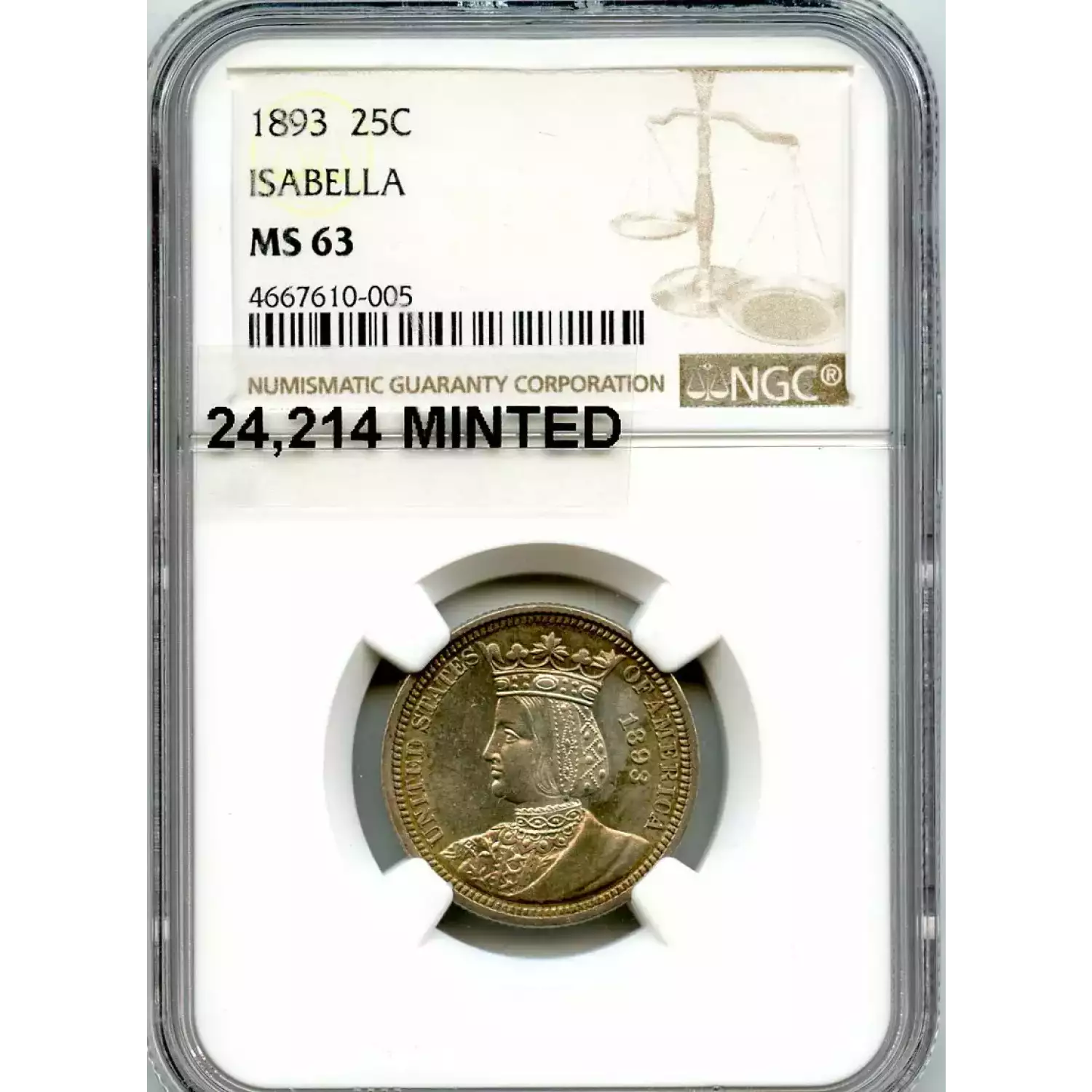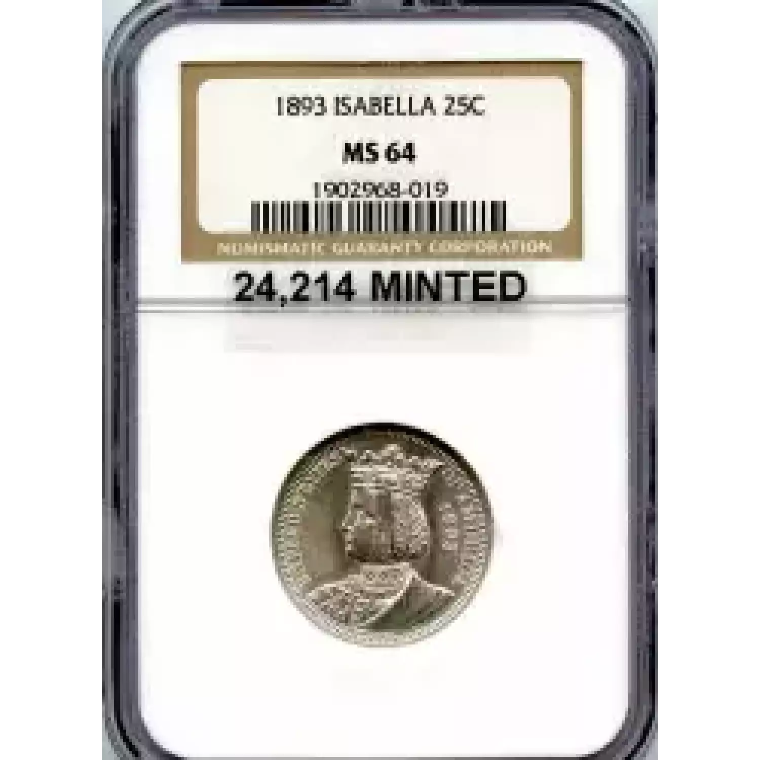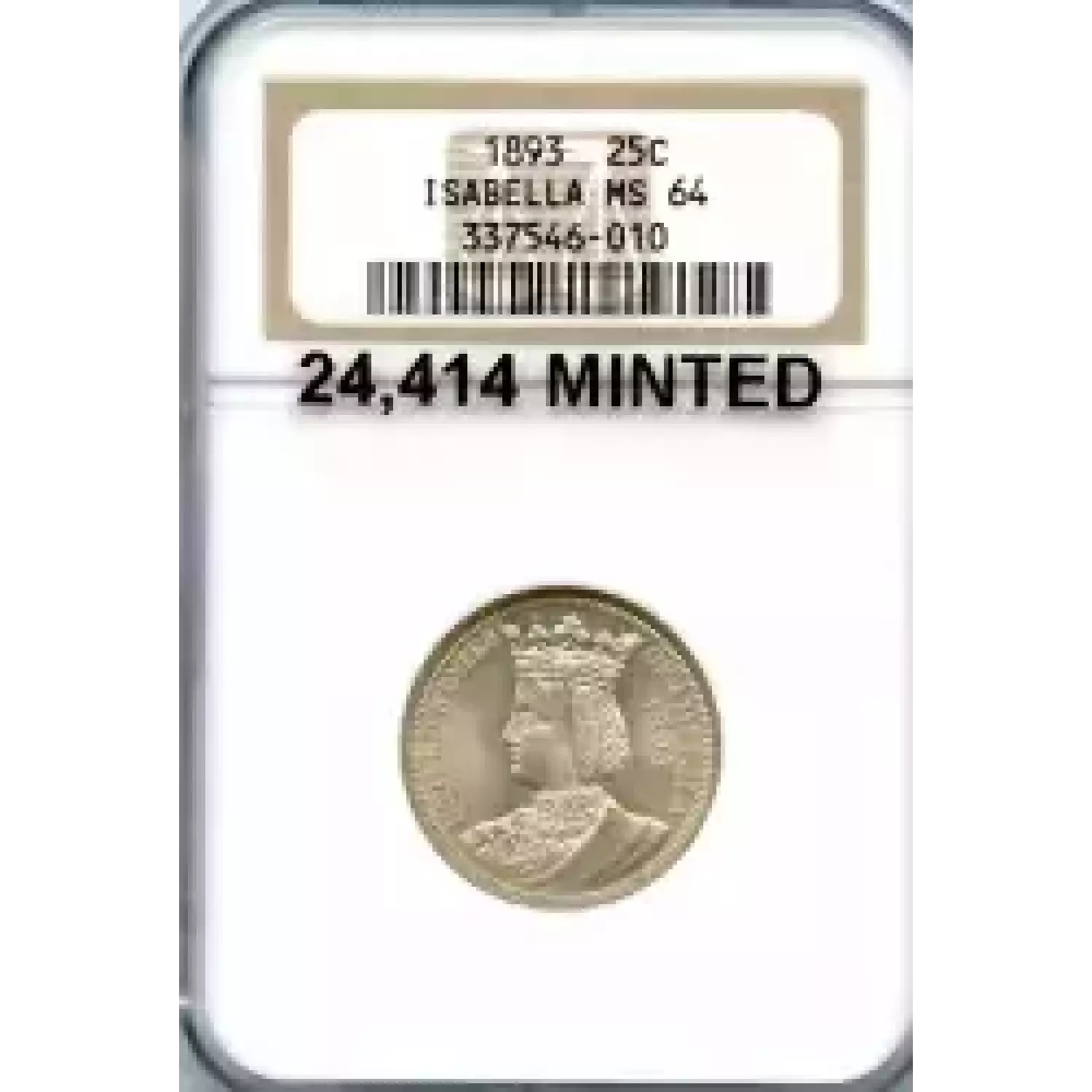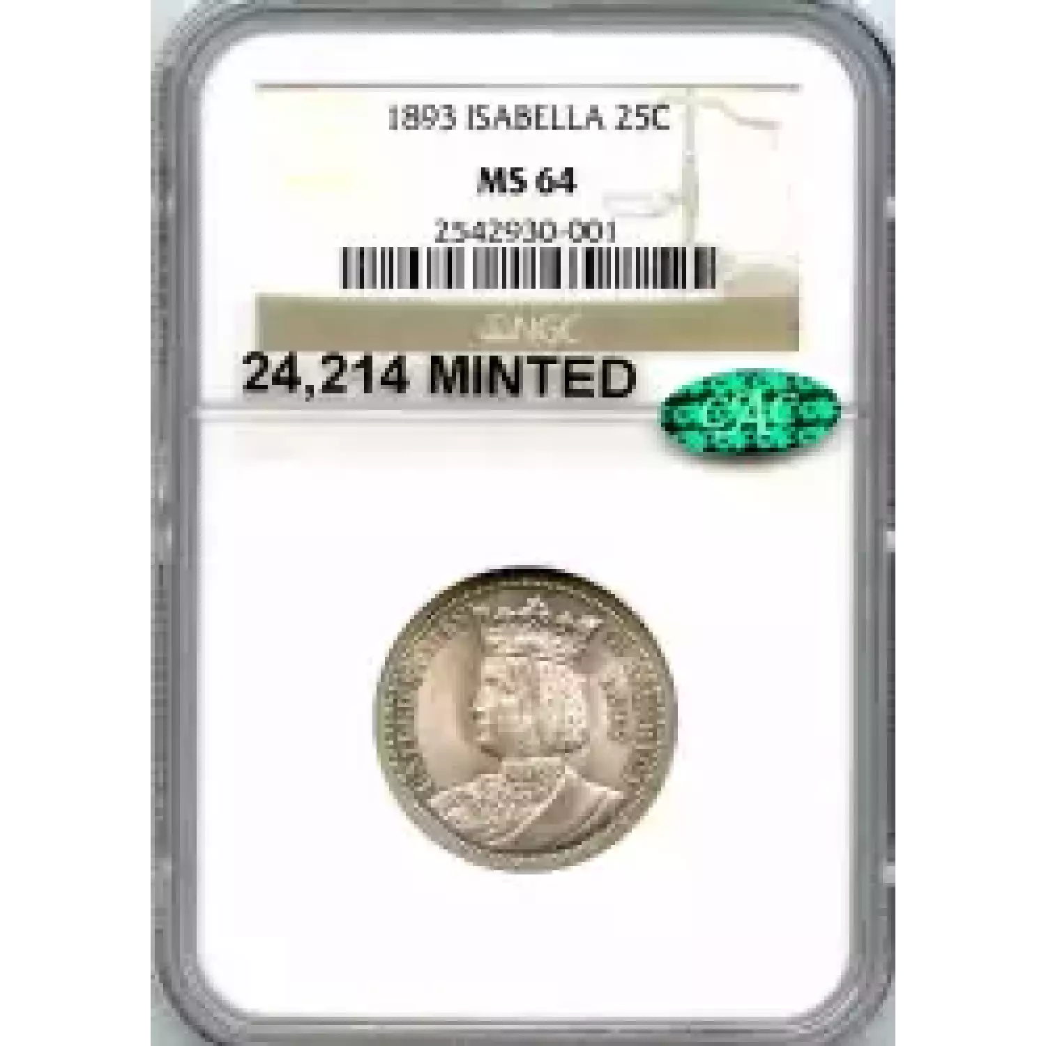 509635 | 1893-MS-64 Classic Commemorative World's Columbian Exposition, Isabella Quarter NGC MS-64 CAC | NGC | MS-64 | Sold: 26/09/2016 | $711 |