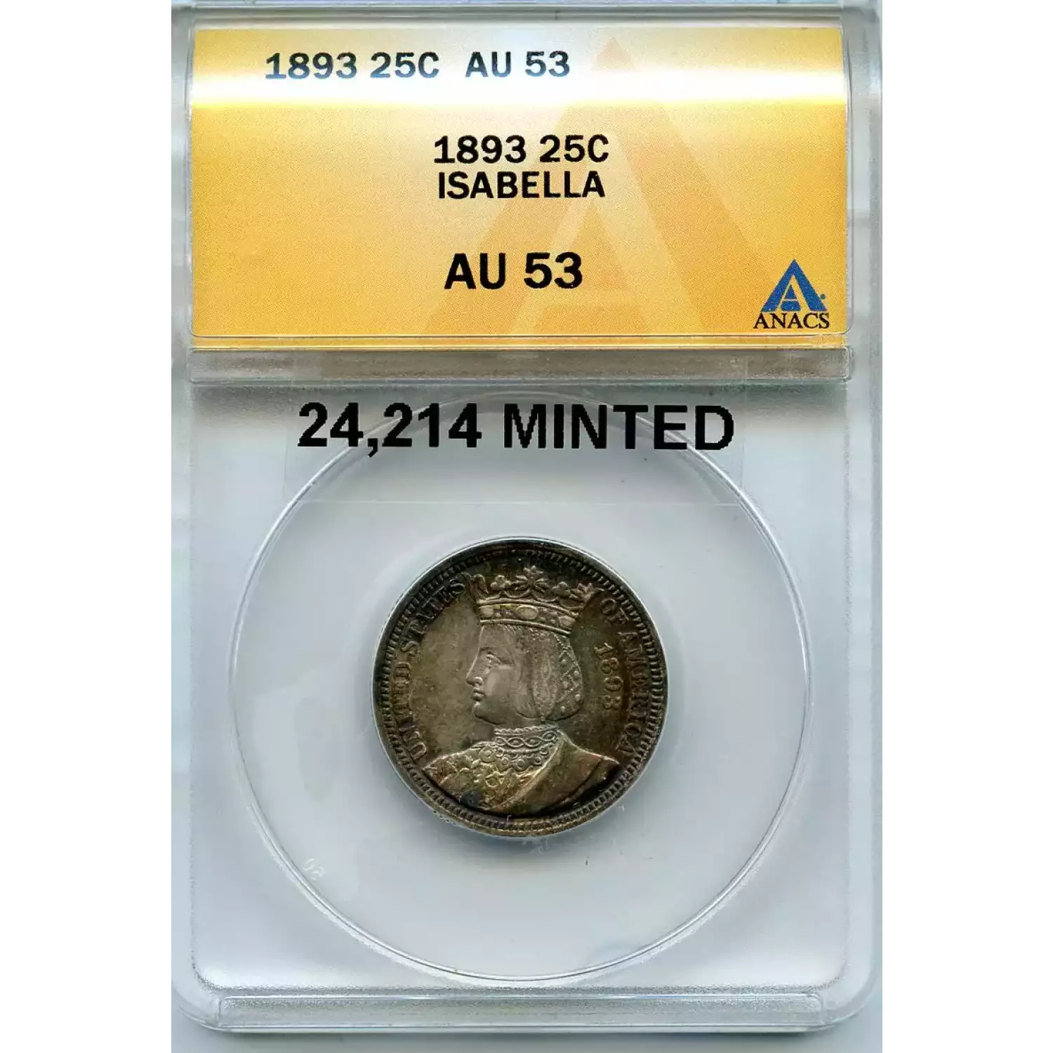 507629 | 1893-AU-53 Classic Commemorative World's Columbian Exposition, Isabella Quarter ANACS AU-53 | ANACS | AU-53 | Sold: 27/02/2016 | $325 |
