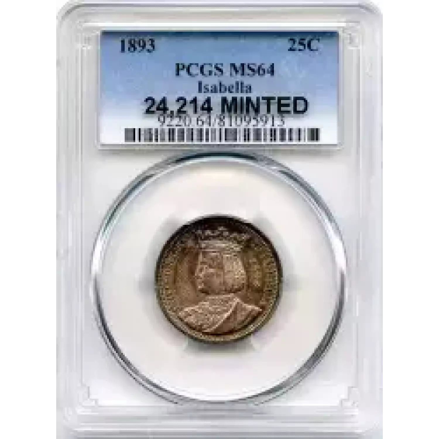 509509 | 1893-MS-64 Classic Commemorative World's Columbian Exposition, Isabella Quarter PCGS MS-64 | PCGS | MS-64 | Sold: 02/12/2017 | $750 |