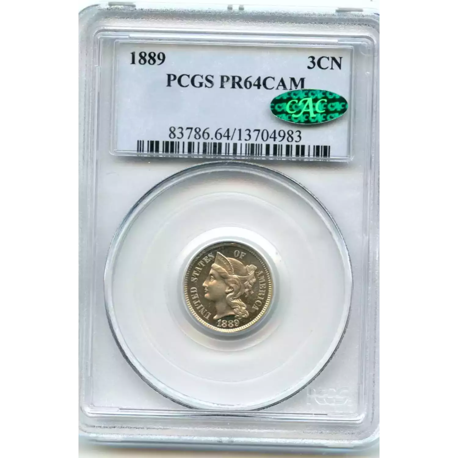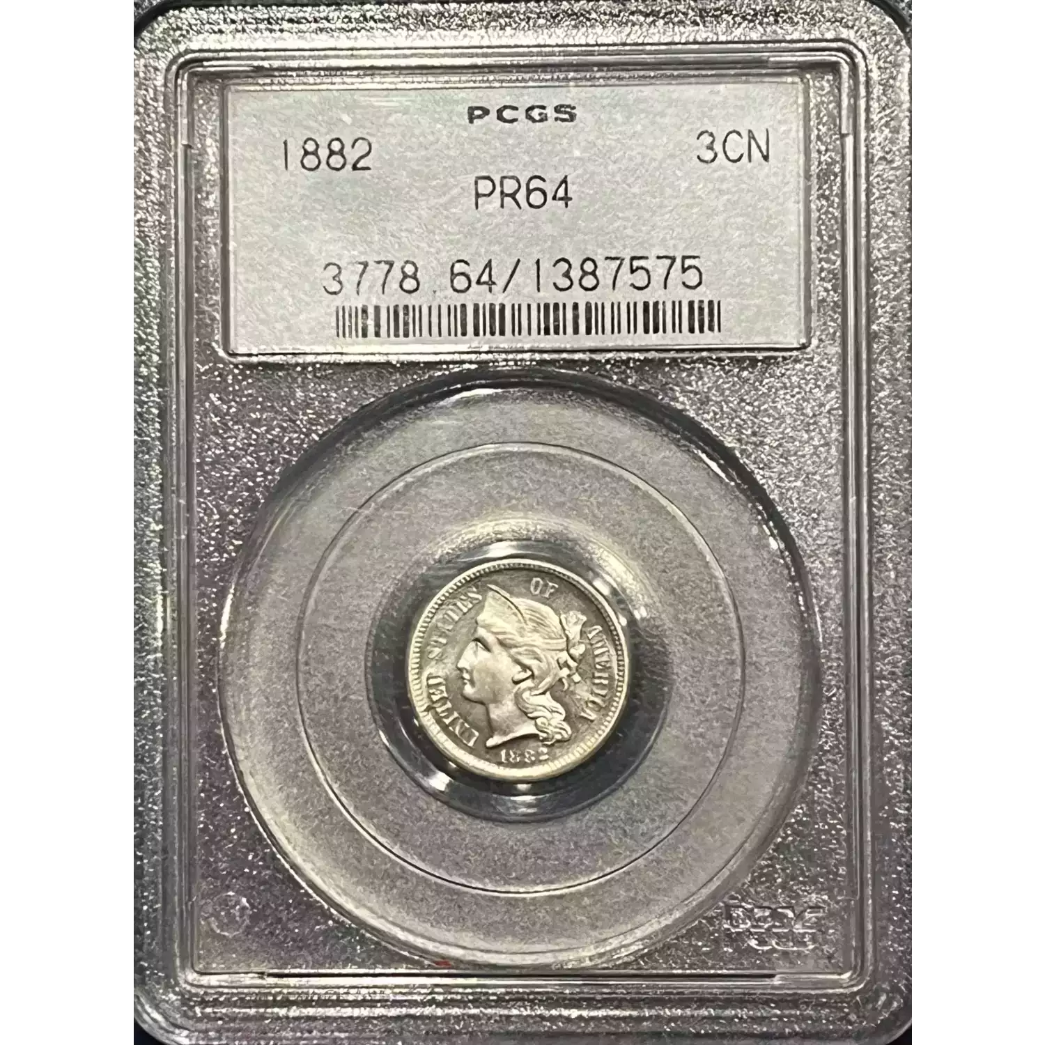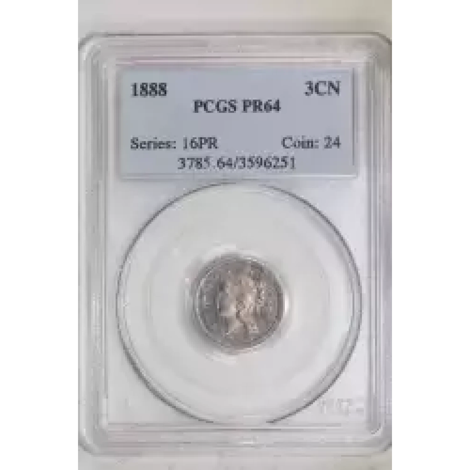 503229 | 1889-PR-64 Three Cent Pieces (Nickel) PCGS PR-64 | PCGS | PR-64 | Sold: 01/10/2005 | $375 |