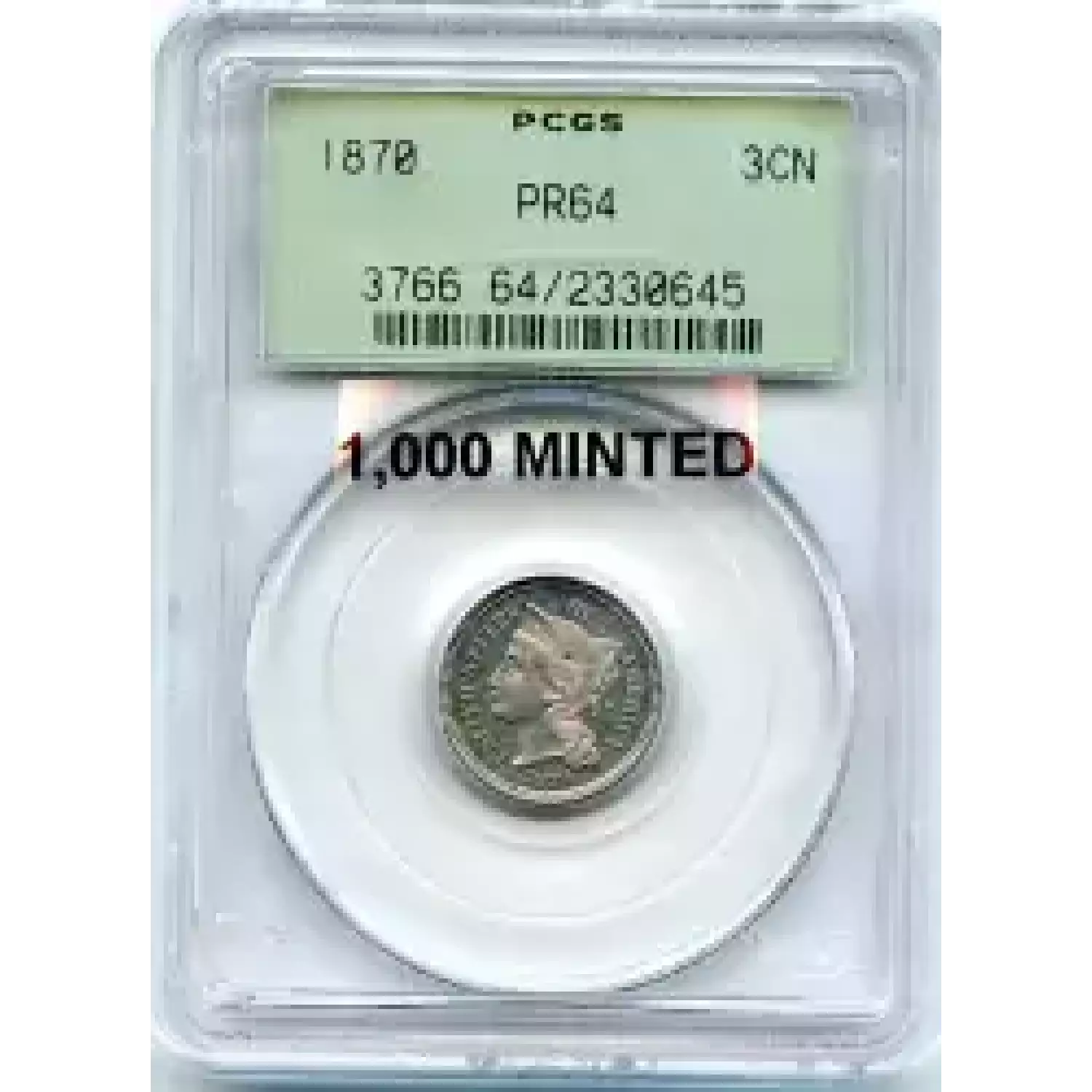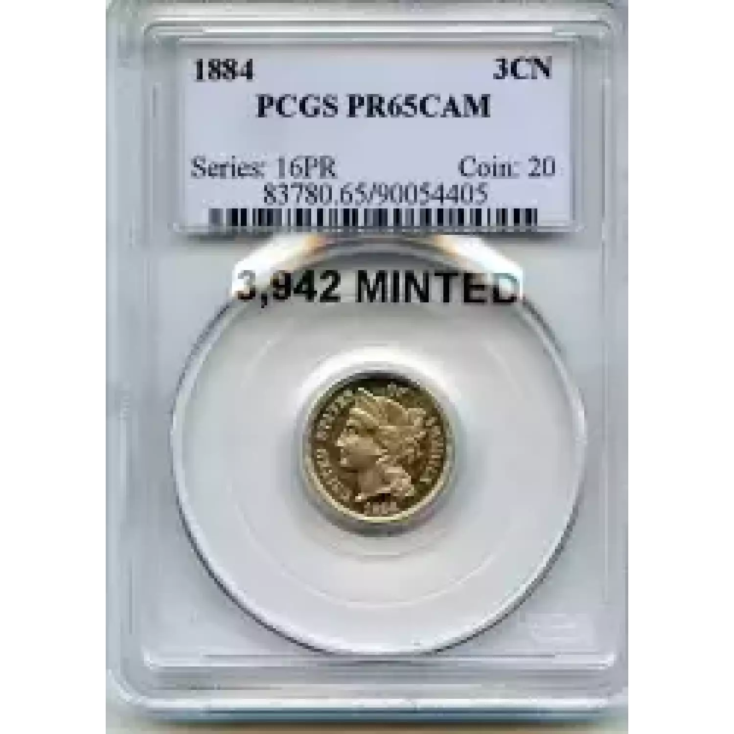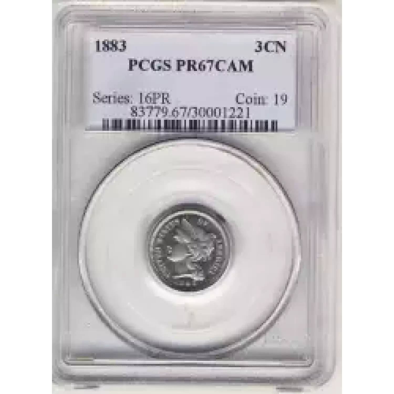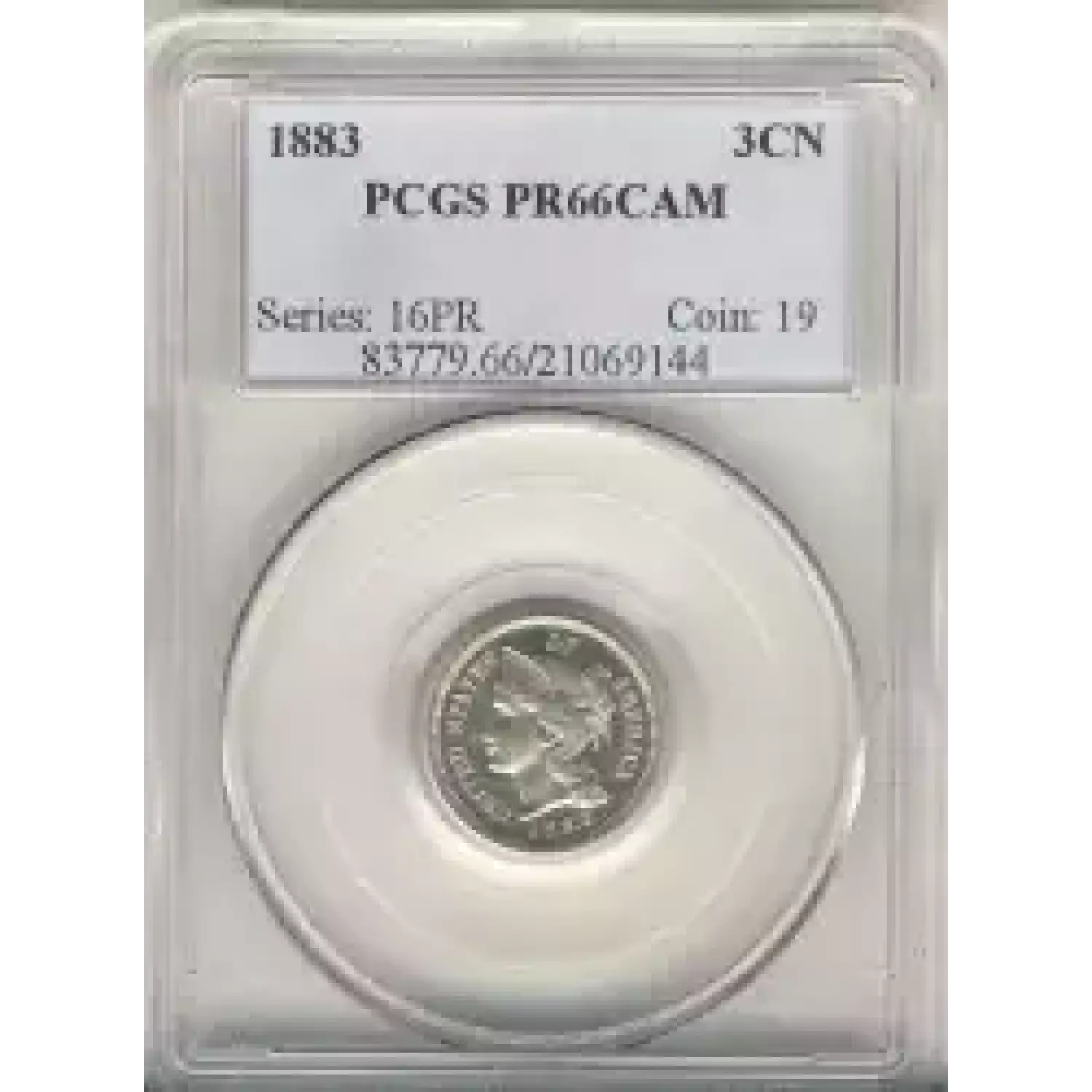 504398 | 1883-PR-66 Three Cent Pieces (Nickel) PCGS PR-66 CAM | PCGS | PR-66 | Sold: 17/08/2008 | $1,000 |