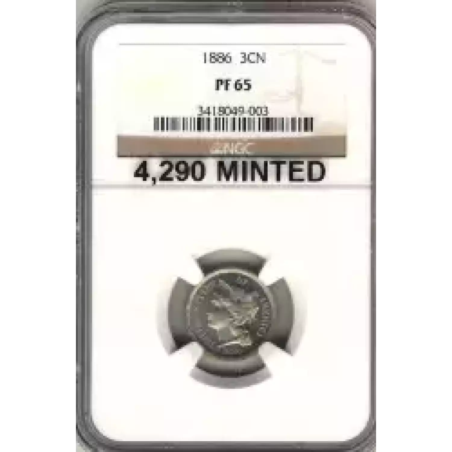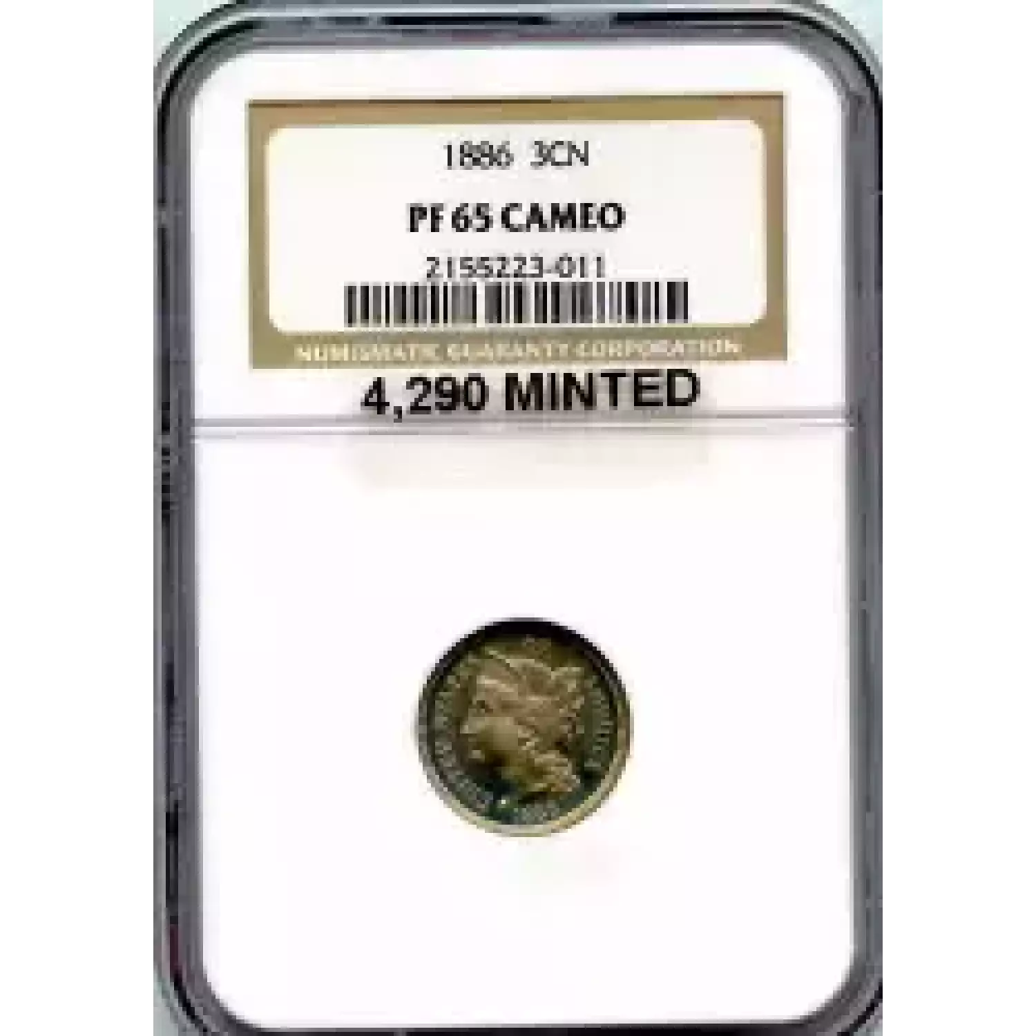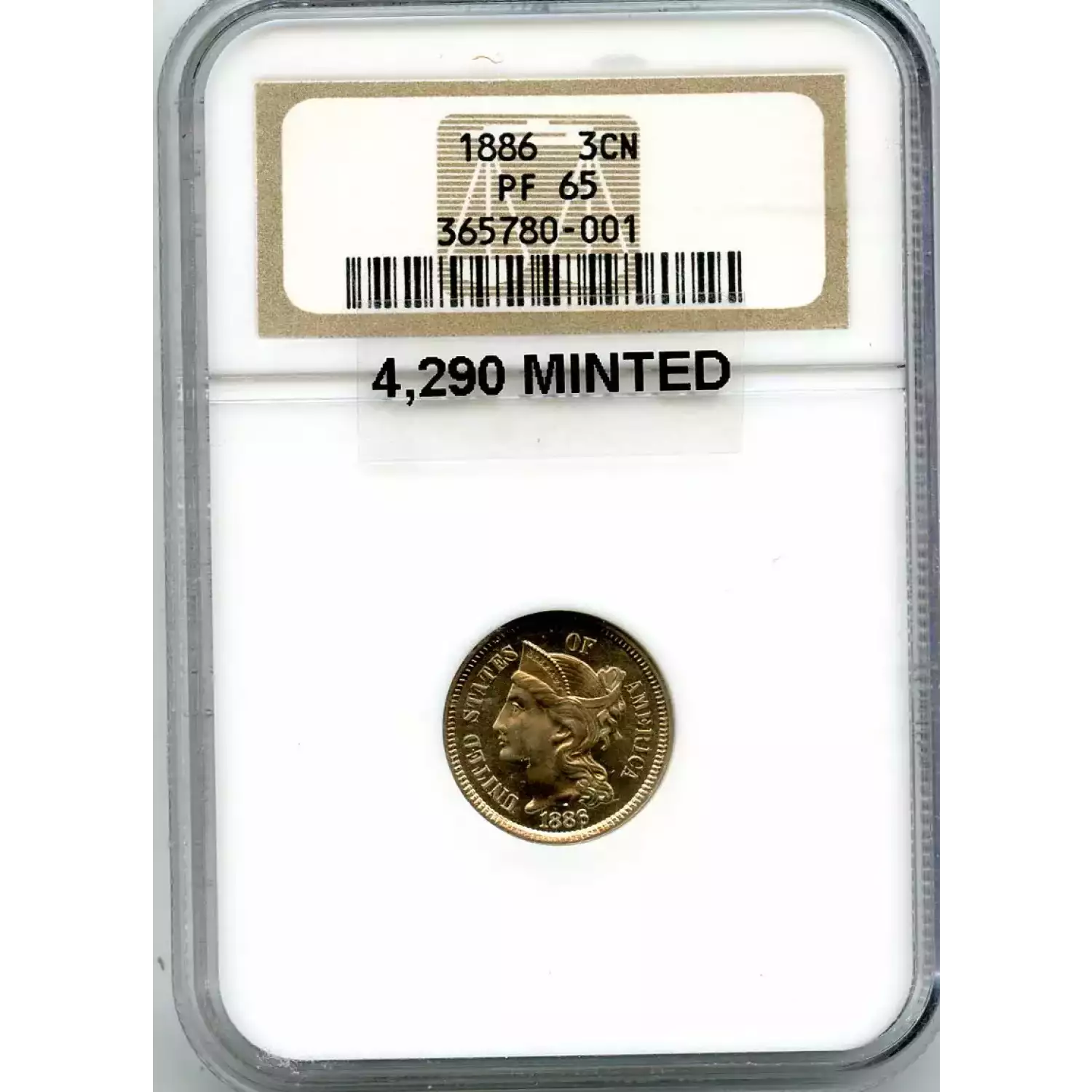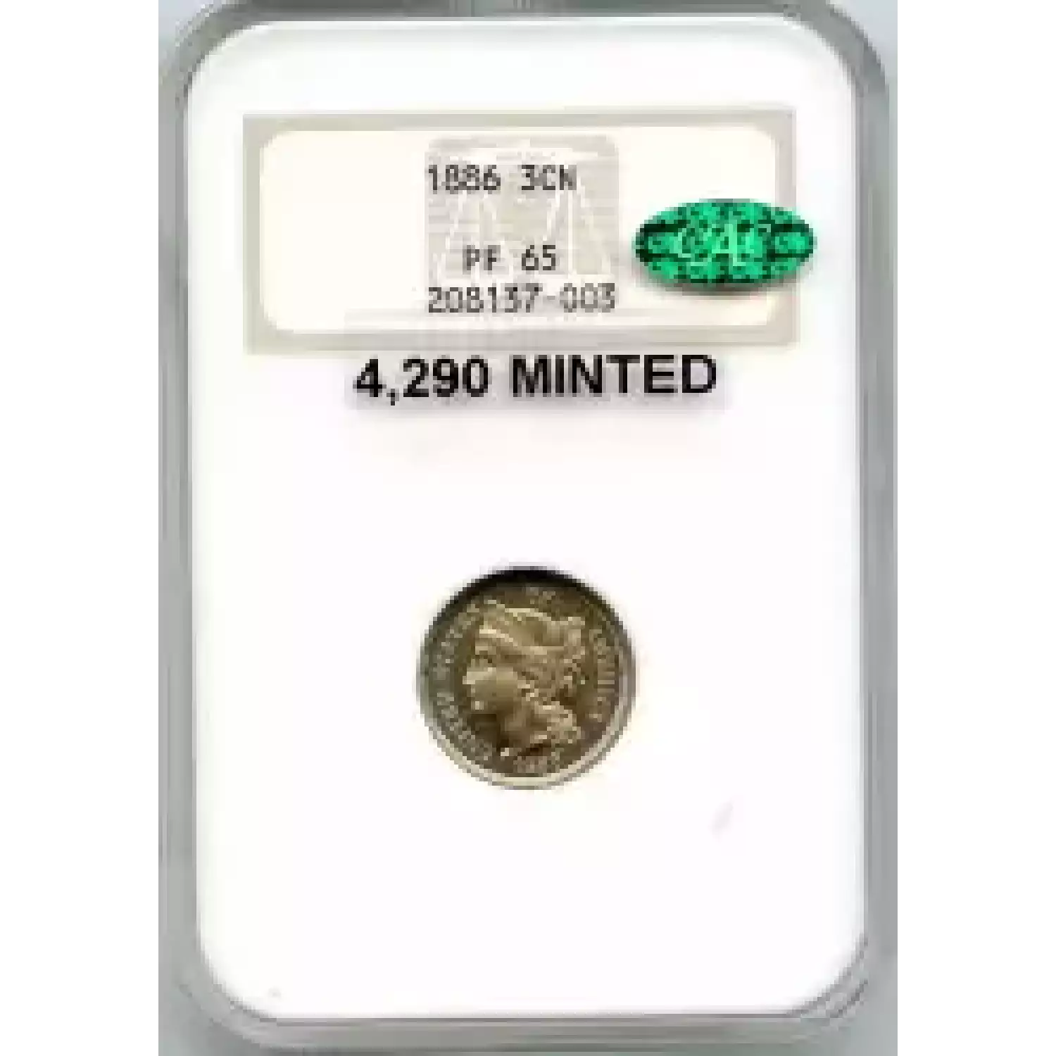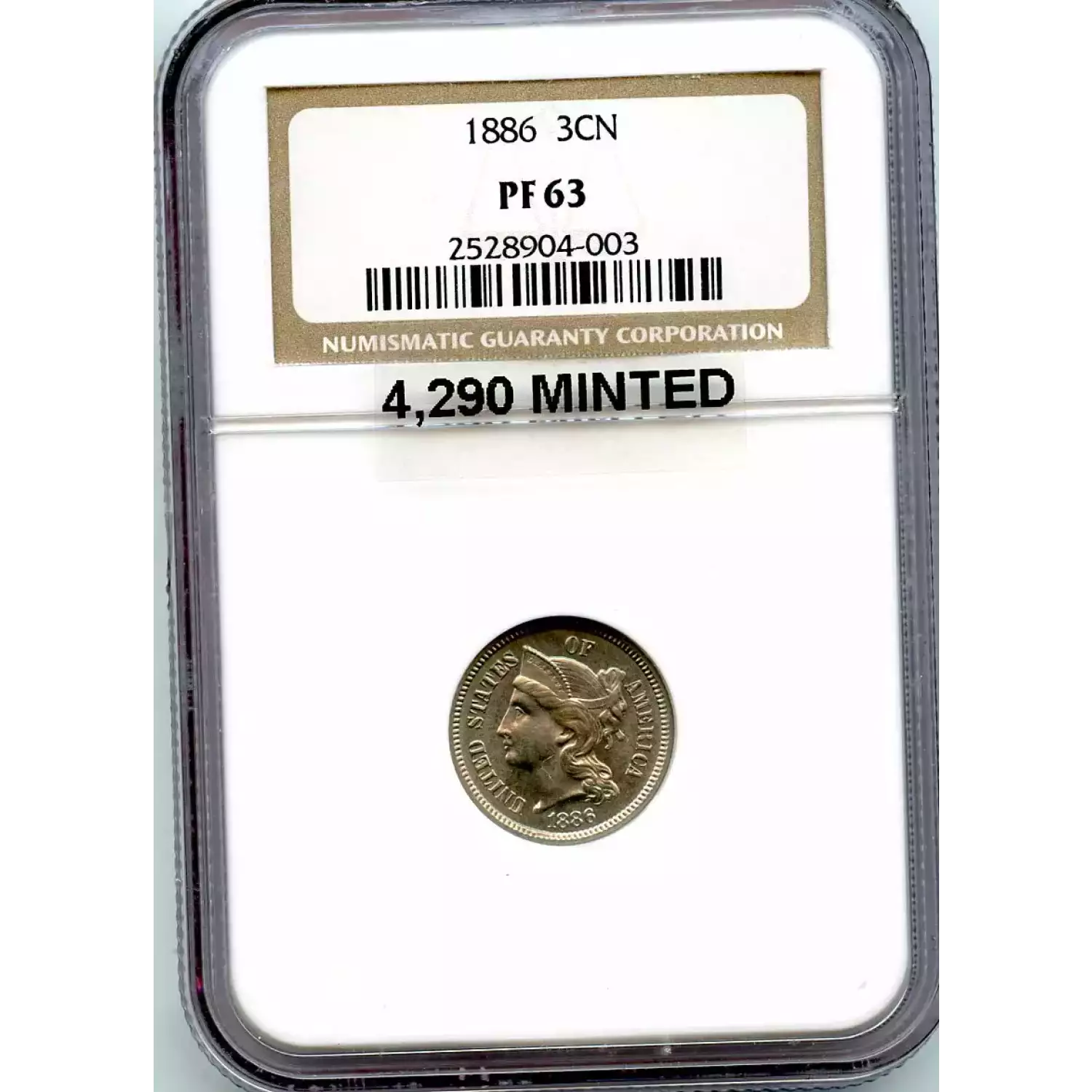 512455 | 1886-PR-65 Three Cent Pieces (Nickel) NGC PR-65 | NGC | PR-65 | Sold: 09/02/2019 | $540 |