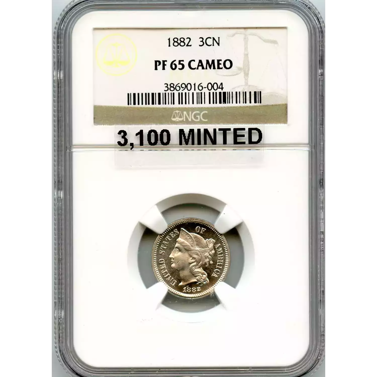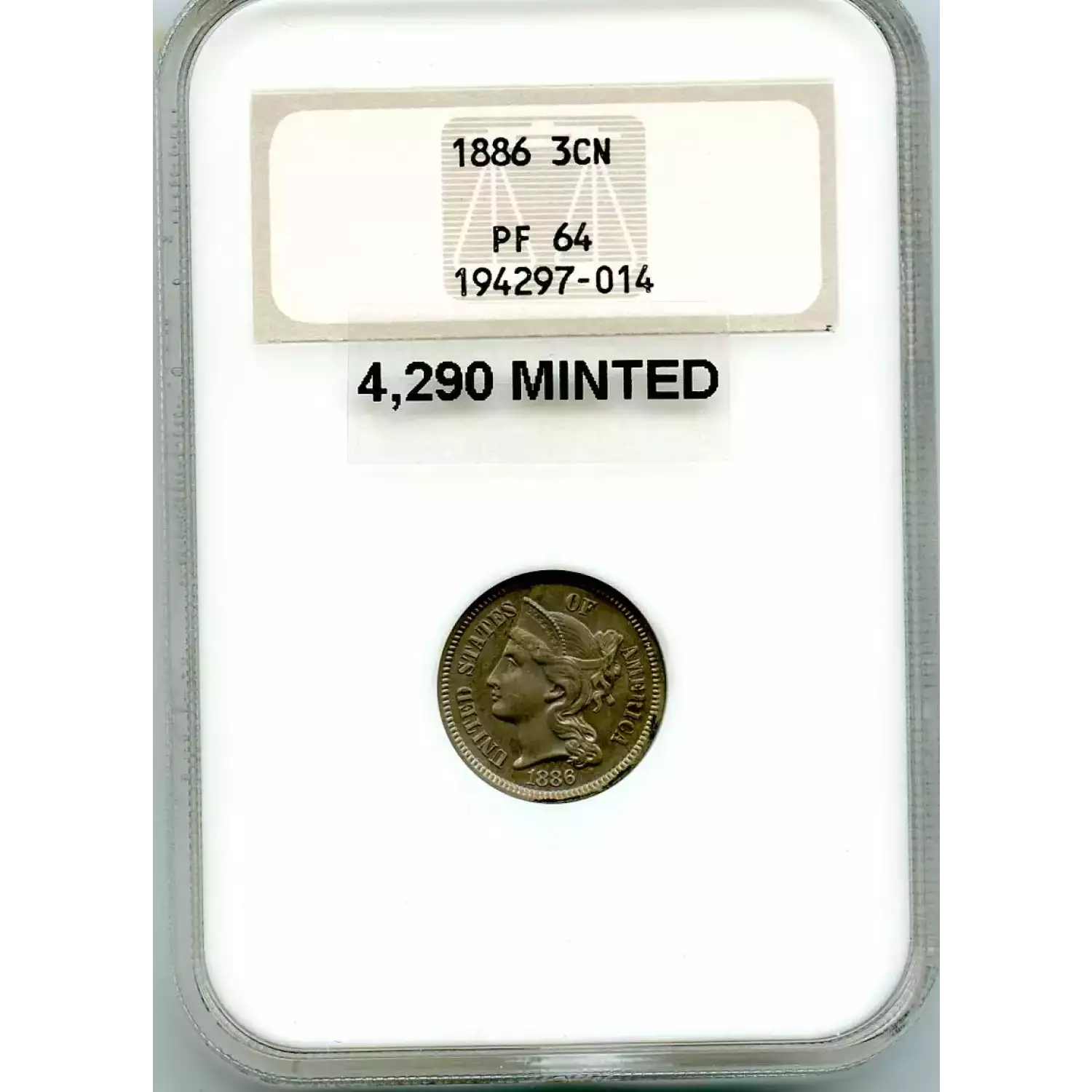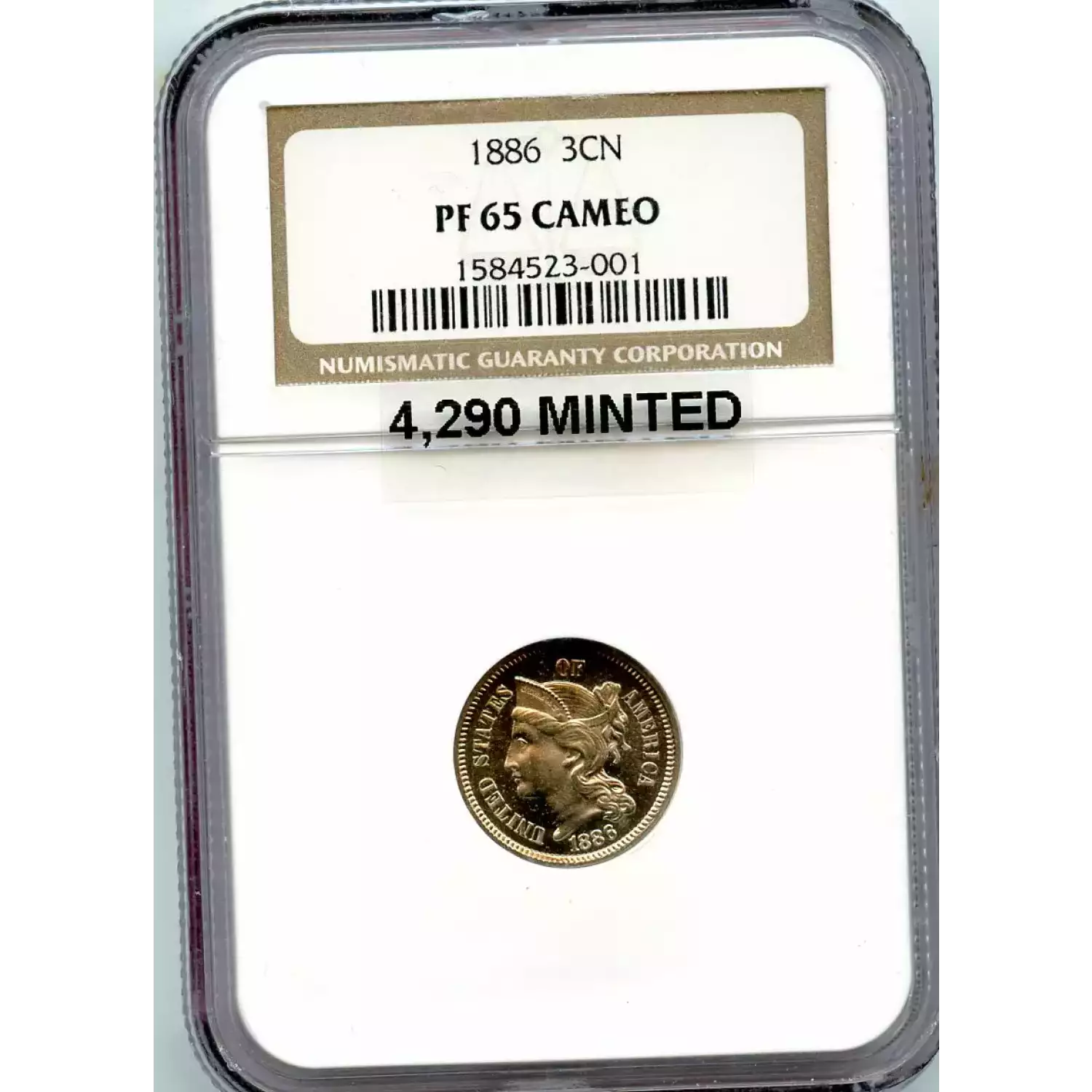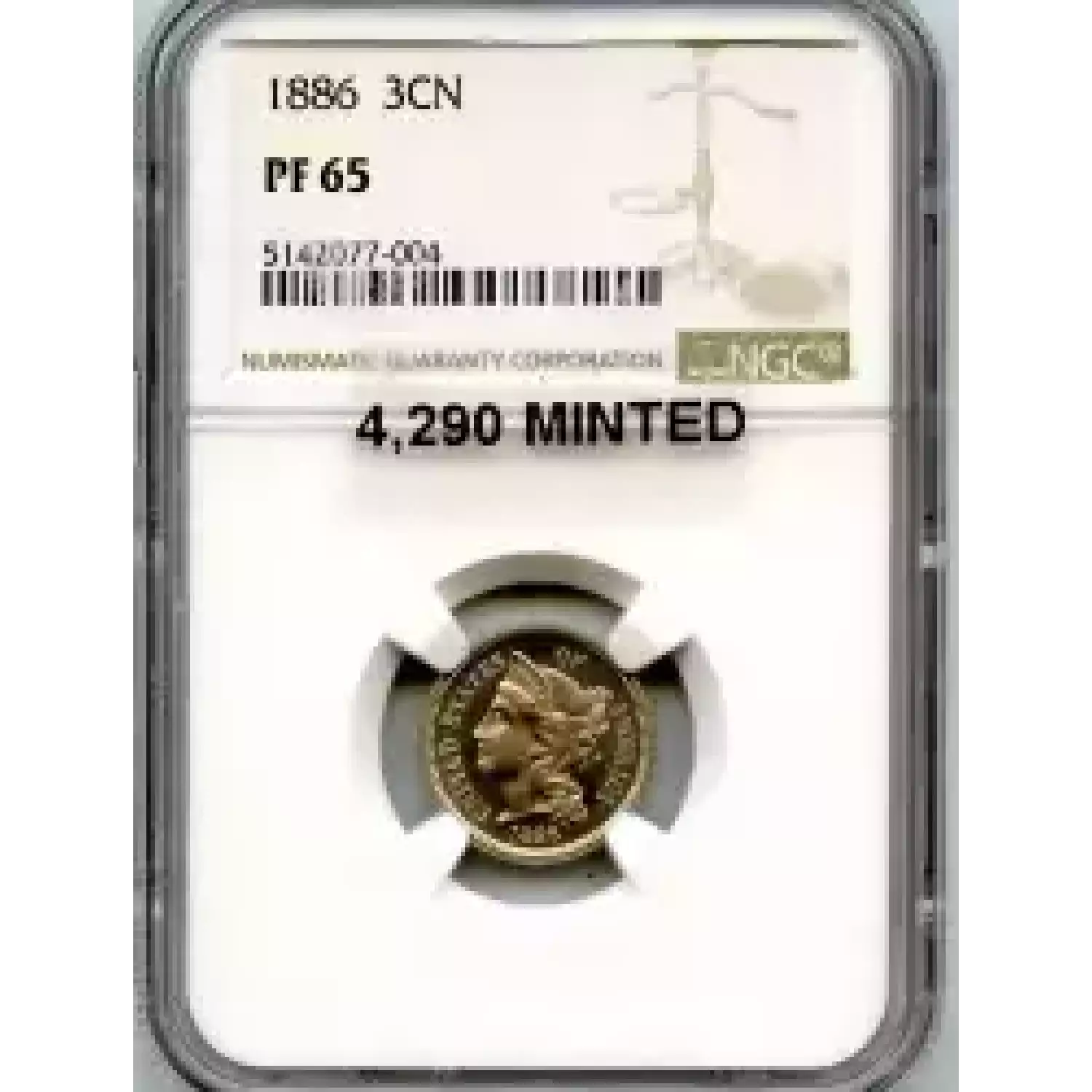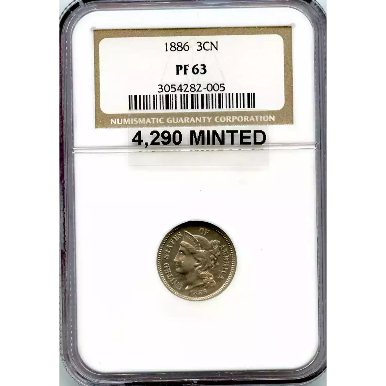 512455 | 1886-PR-65 Three Cent Pieces (Nickel) NGC PR-65 | NGC | PR-65 | Sold: 09/02/2019 | $540 |