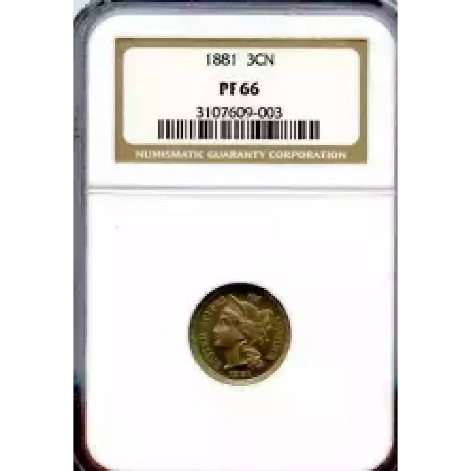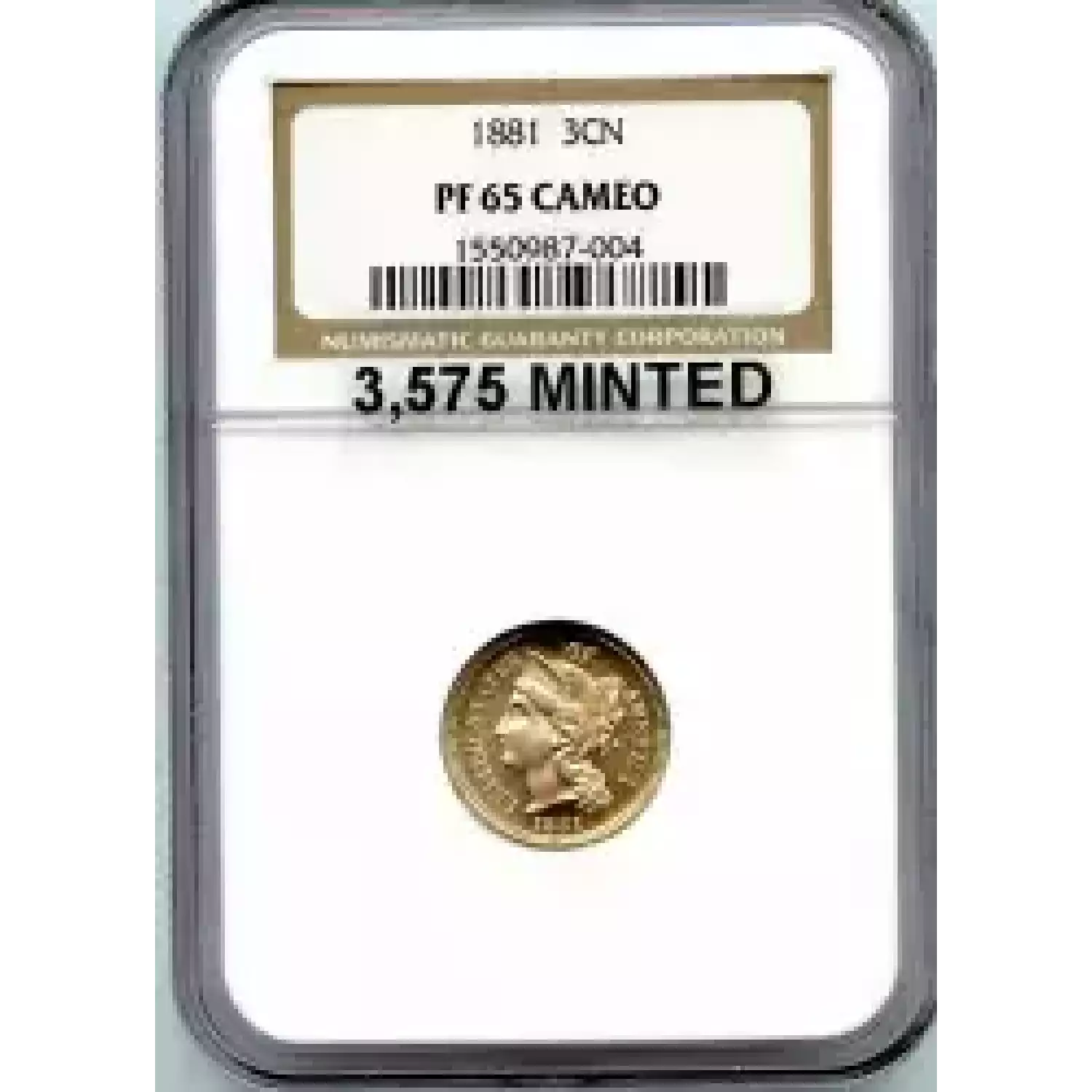 507240 | 1881-PF-64 Three Cent Pieces (Nickel) NGC PF-64 | NGC | PF-64 | Sold: 15/05/2014 | $350 |