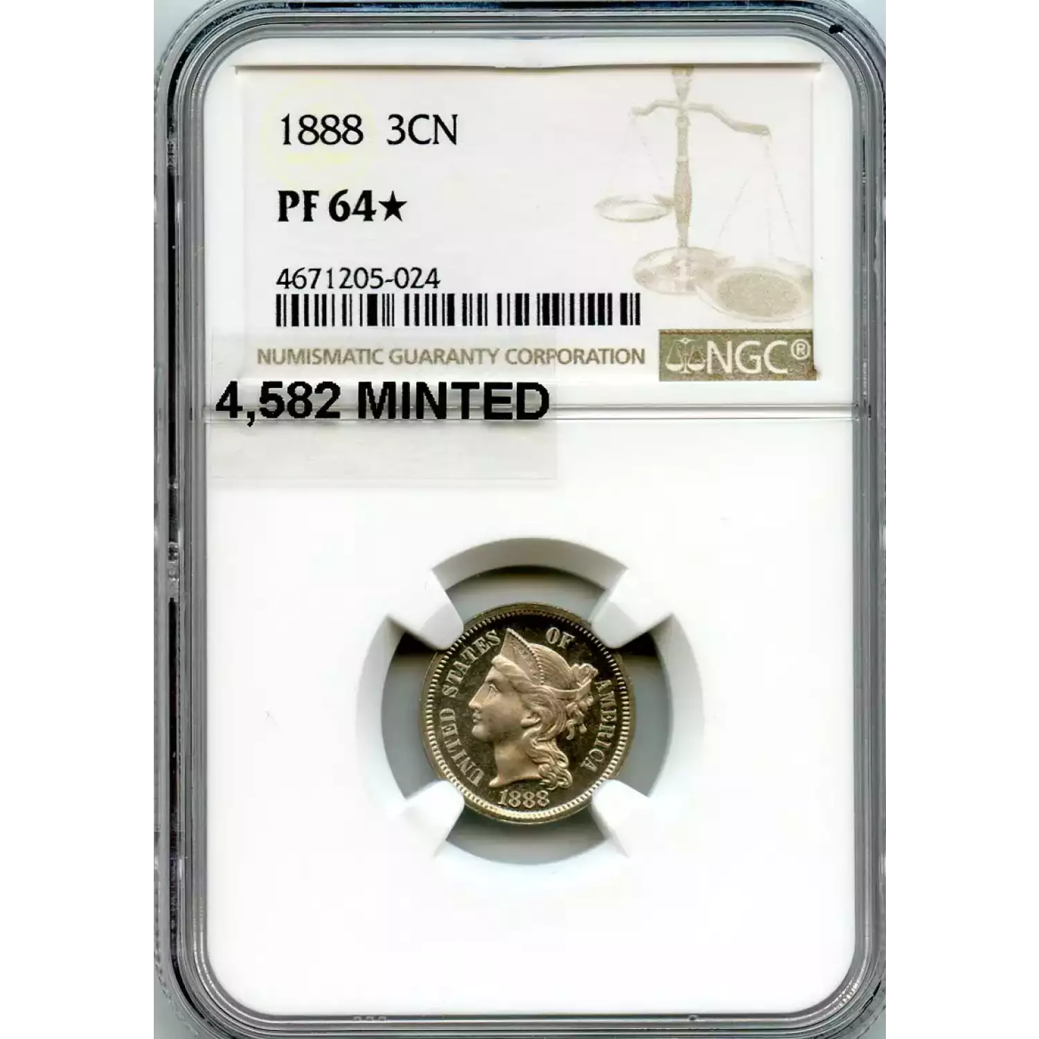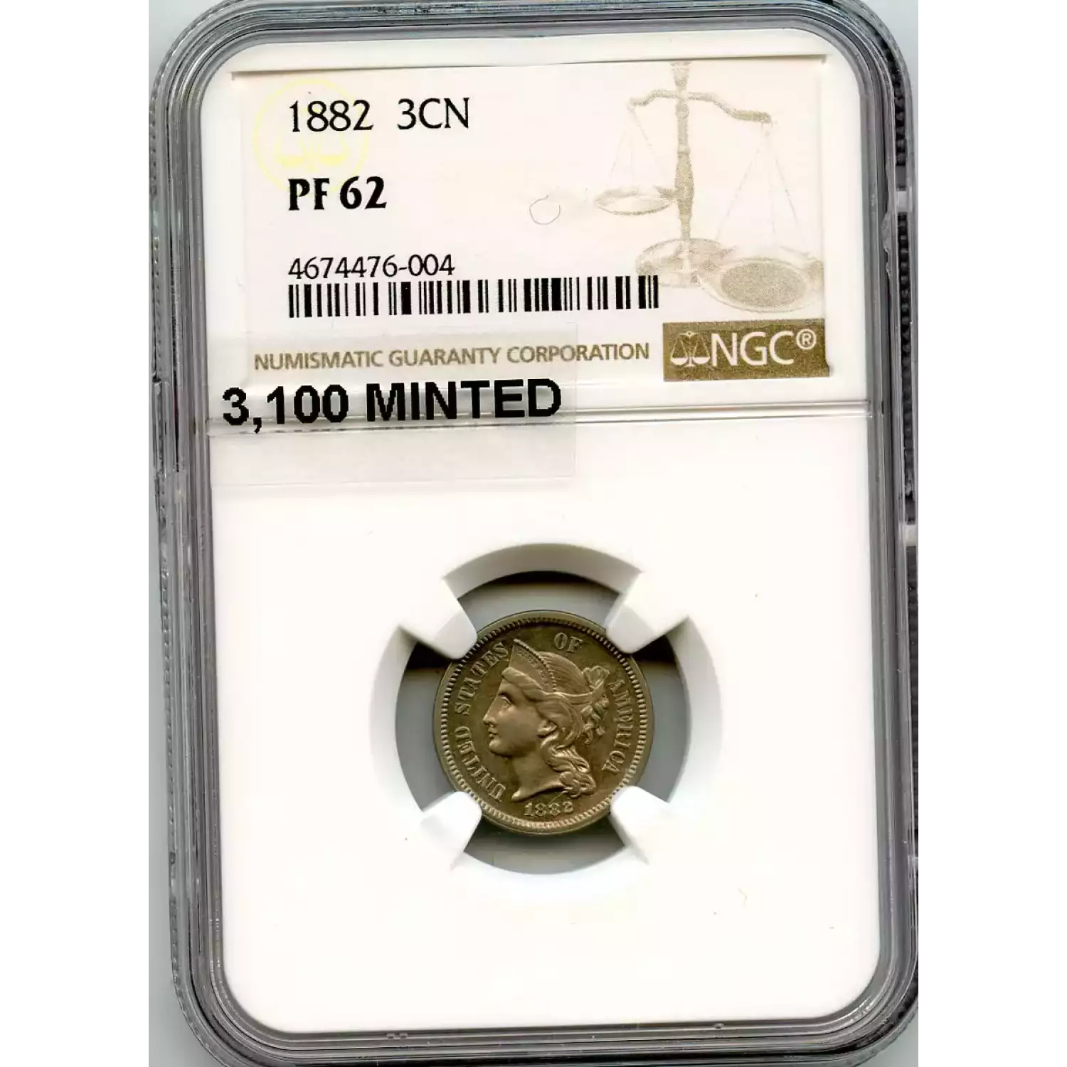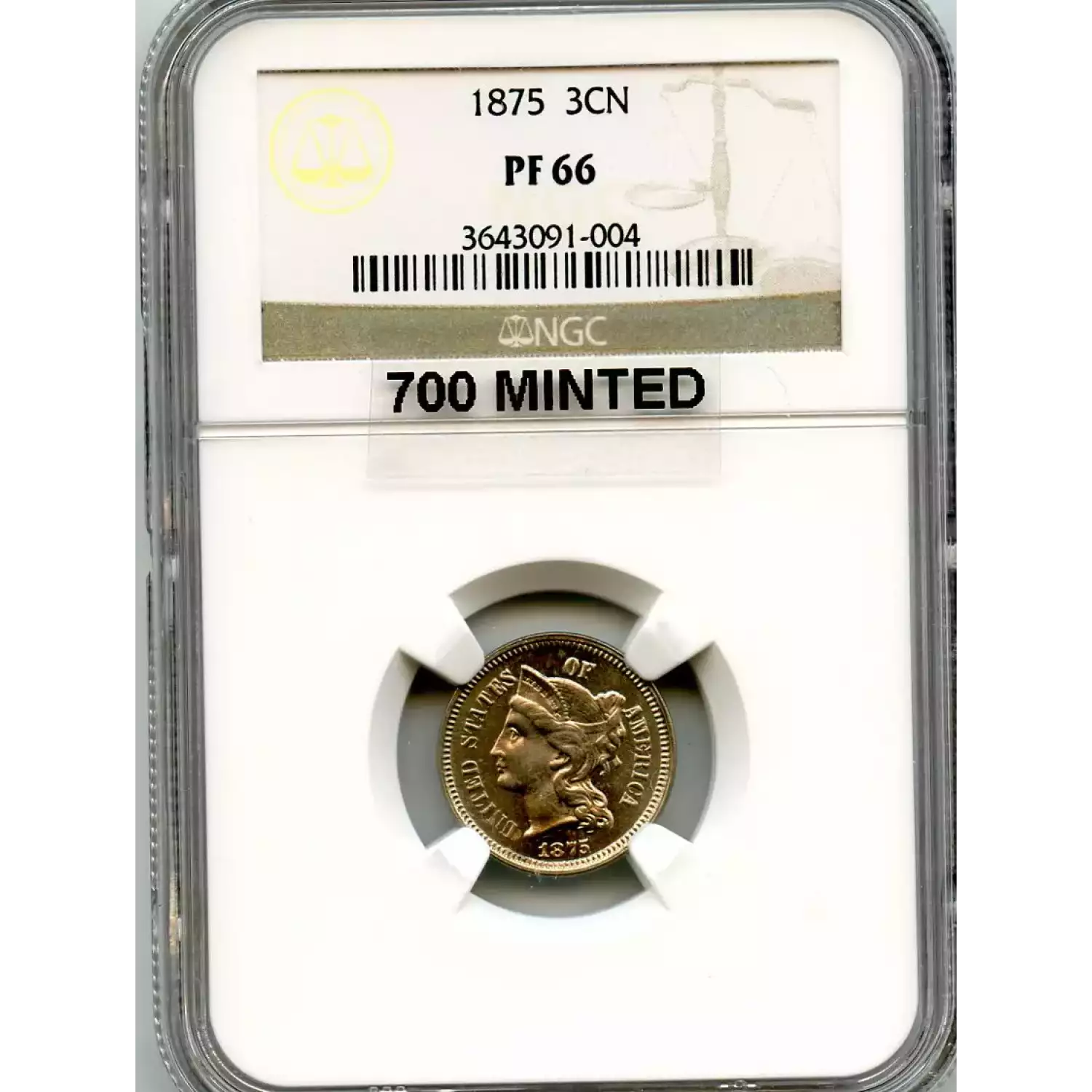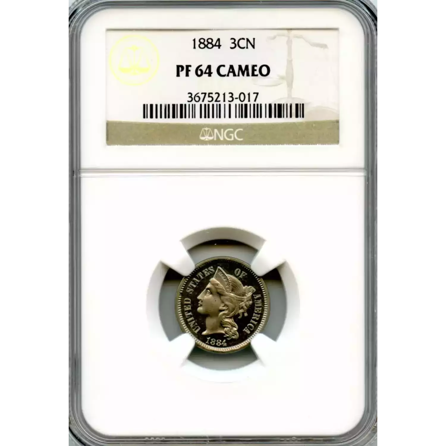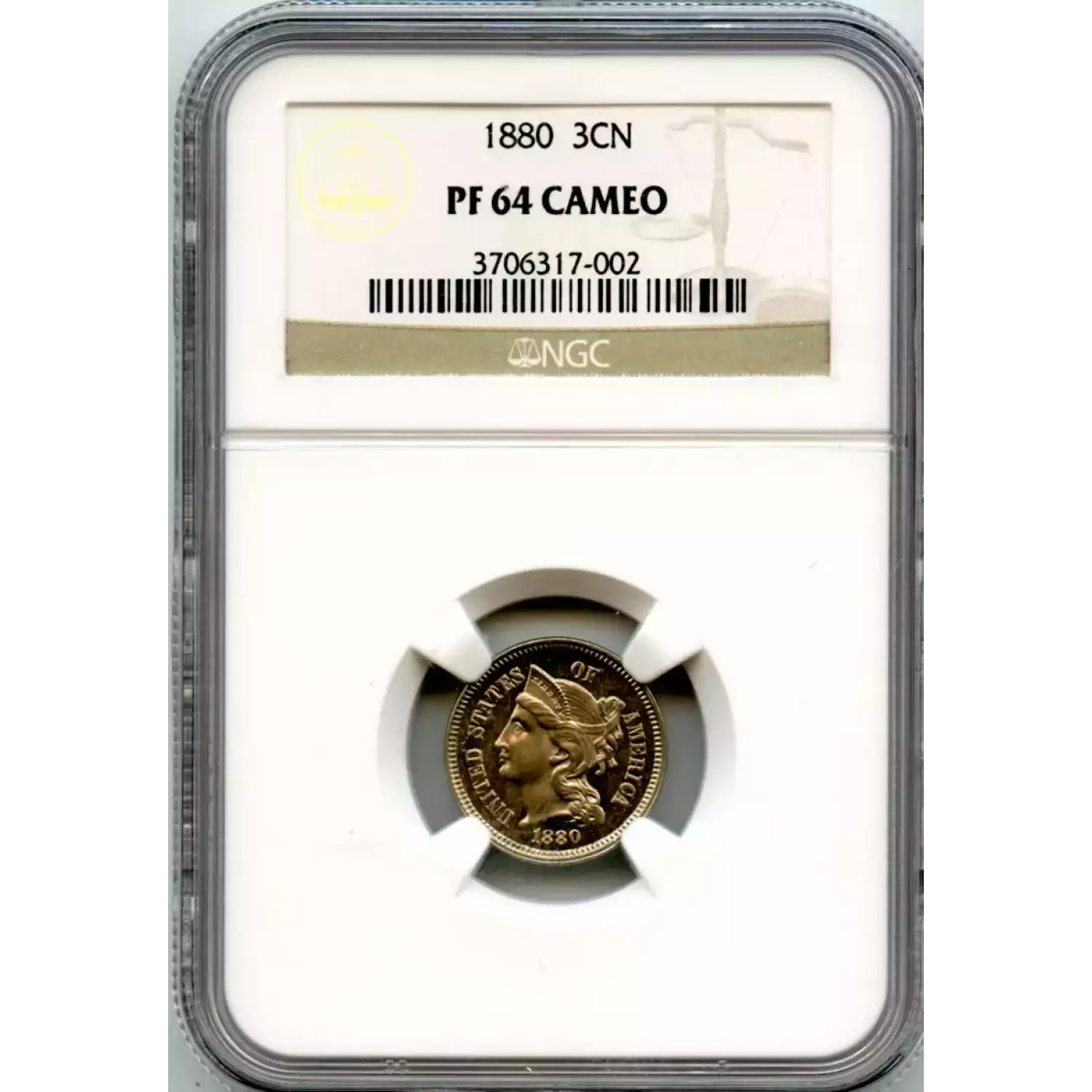520374 | 1886 Three Cent Pieces (Nickel) NGC PF-64 | NGC | PF-64 | Sold: 07/11/2023 | $550 |