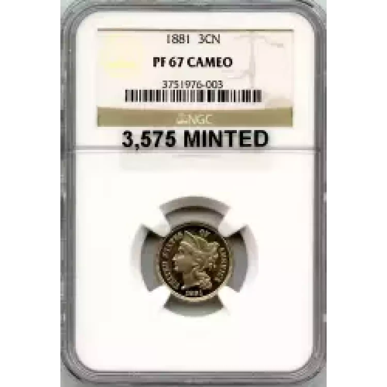 506526 | 1881-PF-66 Three Cent Pieces (Nickel) NGC PF-66 | NGC | PF-66 | Sold: 06/08/2013 | $576 |