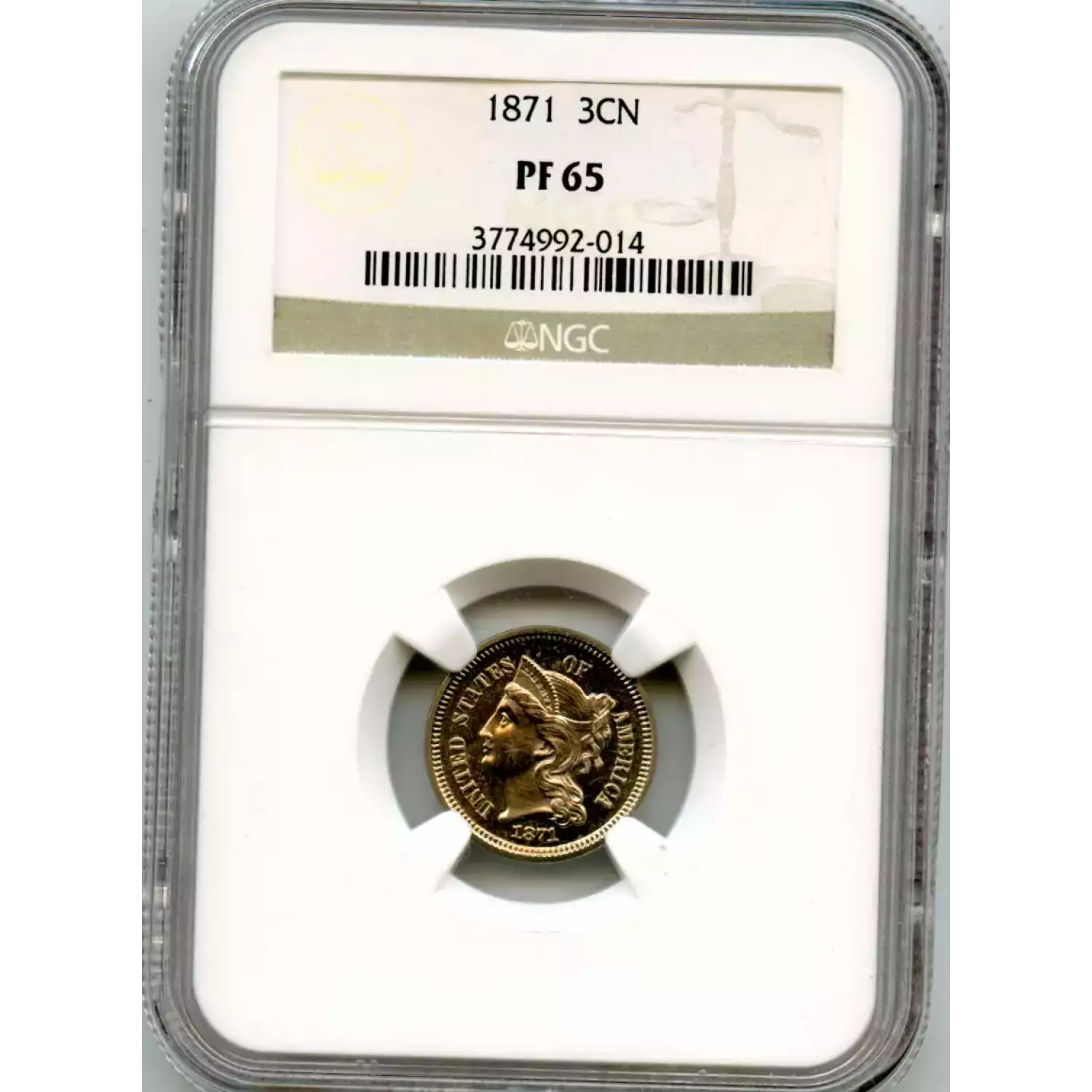 508631 | 1871-PF-65 Three Cent Pieces (Nickel) NGC PF-65 | NGC | PF-65 | Sold: 19/04/2015 | $615 |
