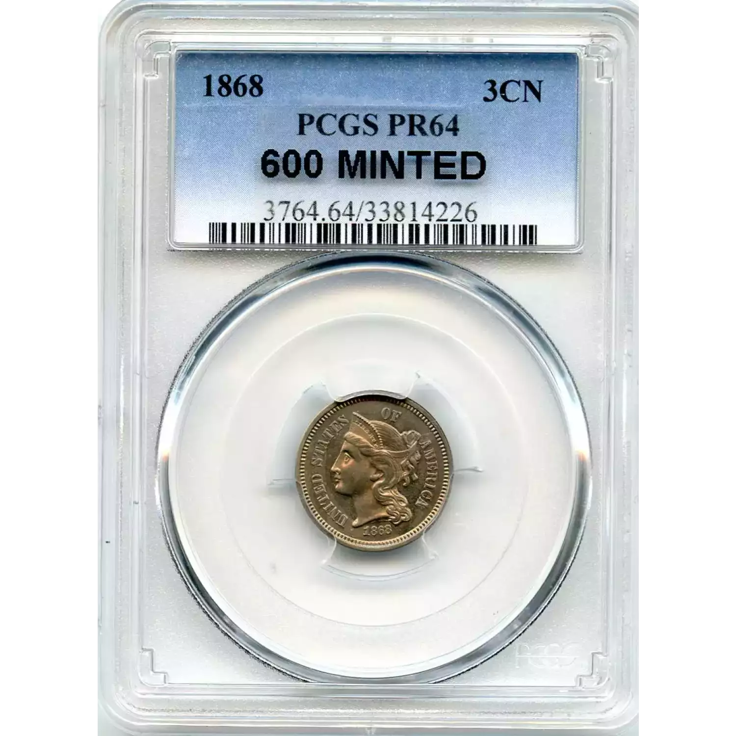 509722 | 1868-PR-64 Three Cent Pieces (Nickel) PCGS PR-64 | PCGS | PR-64 | Sold: 07/05/2017 | $450 |