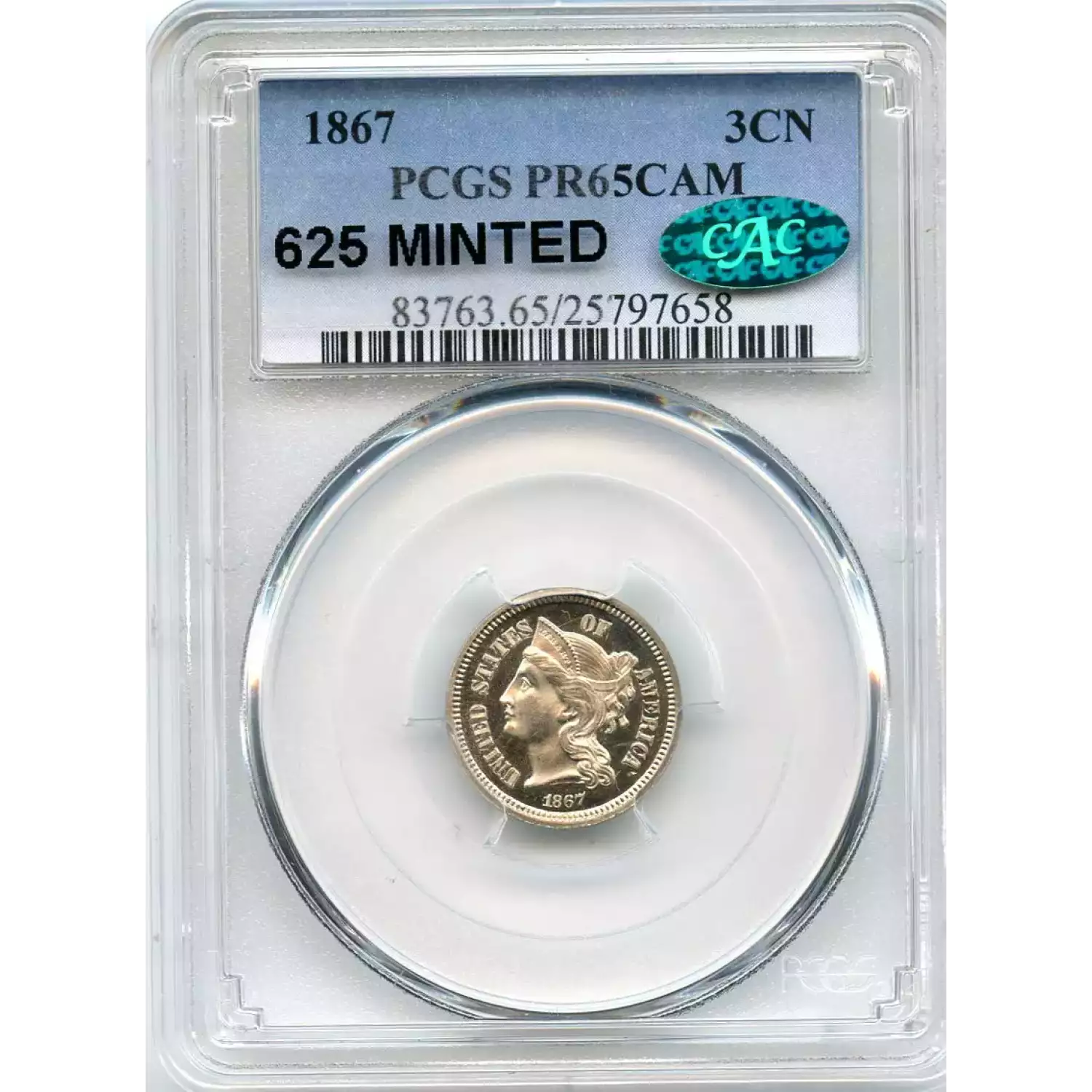 509776 | 1867-PR-65 Three Cent Pieces (Nickel) PCGS PR-65 CAM CAC | PCGS | PR-65 | Sold: 29/09/2016 | $855 |