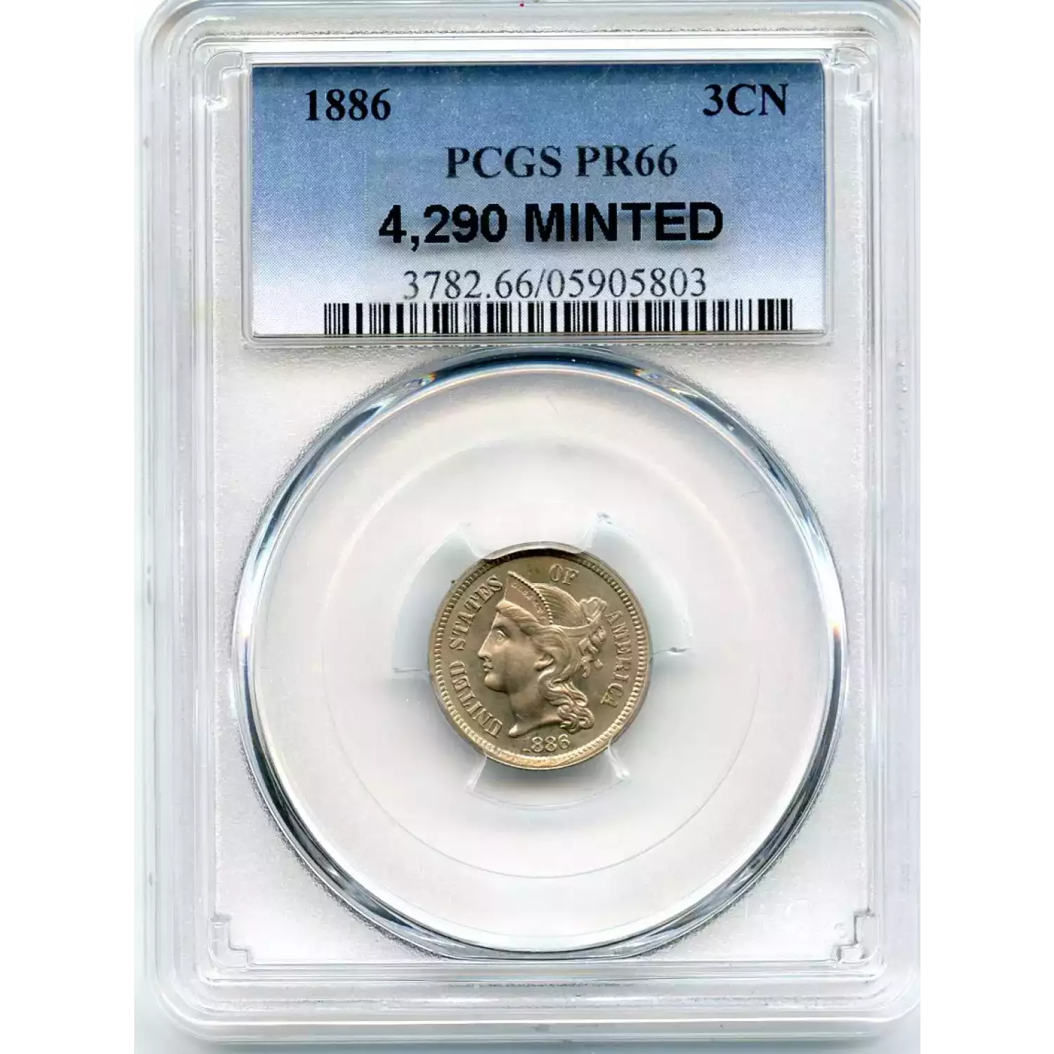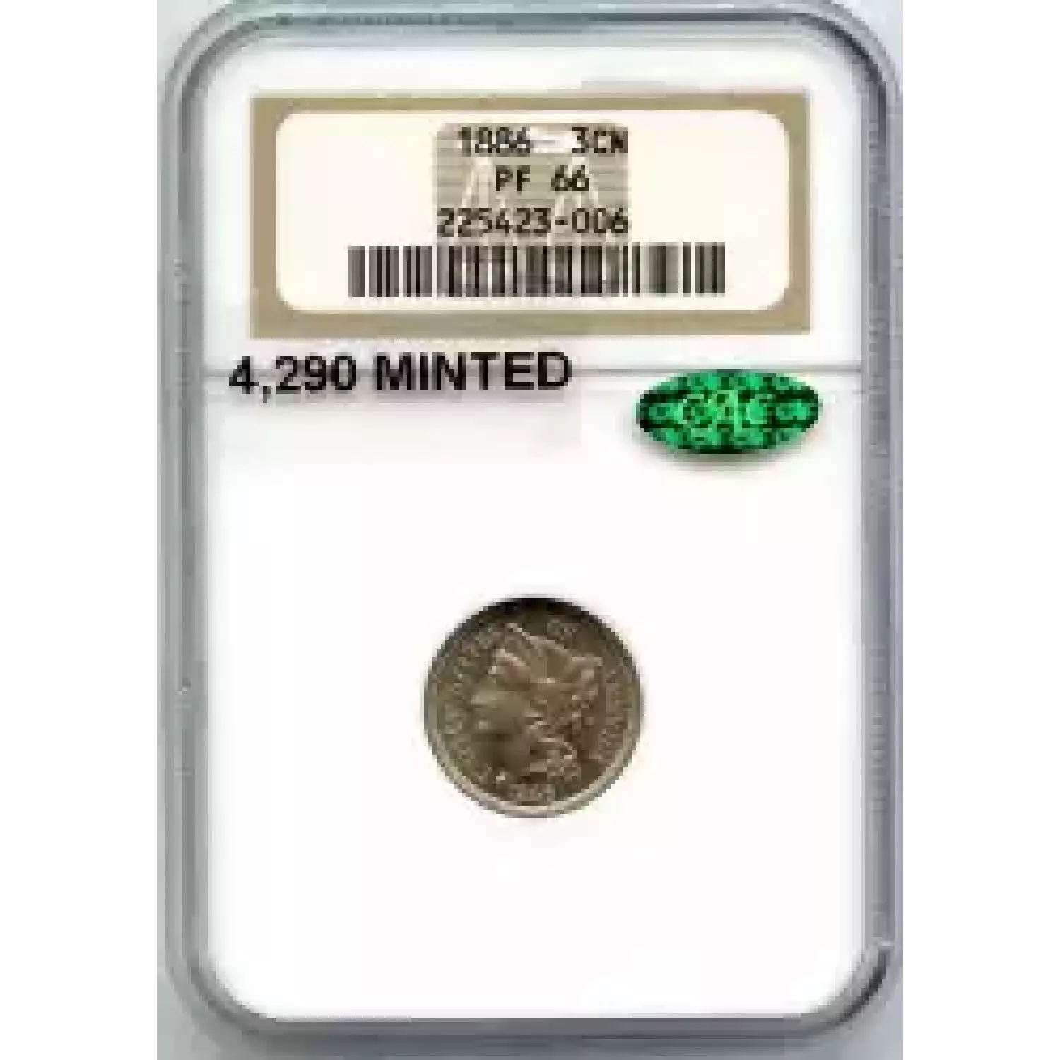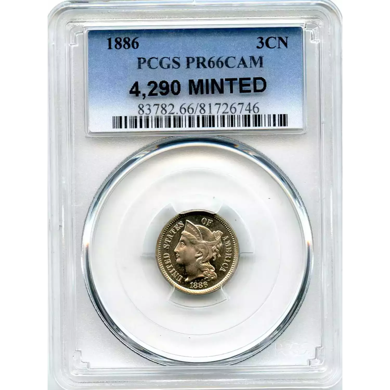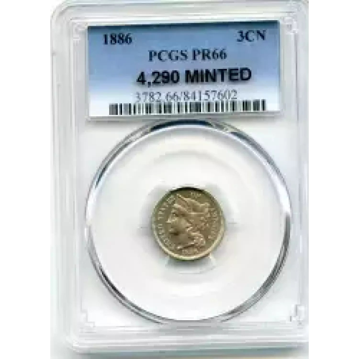 510857 | 1886-PR-66 Three Cent Pieces (Nickel) PCGS PR-66 DCAM | PCGS | PR-66 | Sold: 11/09/2017 | $6,000 |