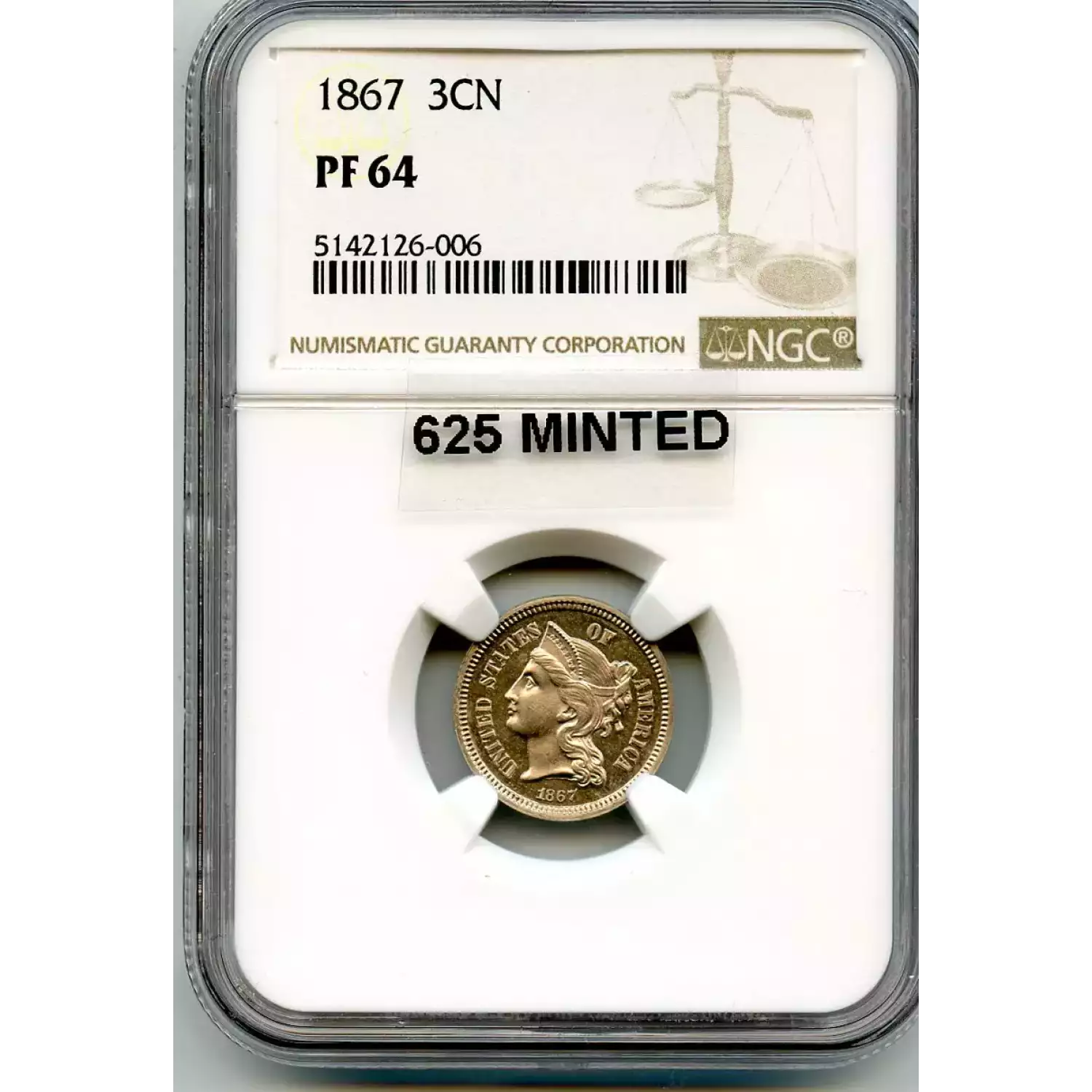 510348 | 1867-PF-64 Three Cent Pieces (Nickel) NGC PF-64 | NGC | PF-64 | Sold: 08/07/2017 | $540 |