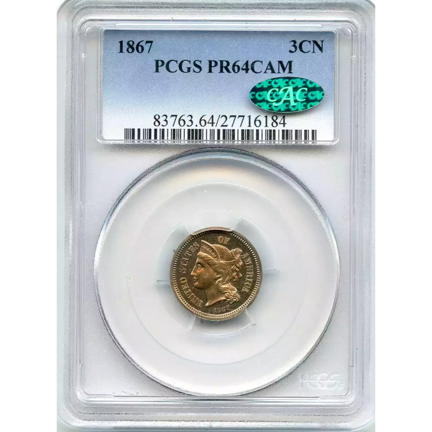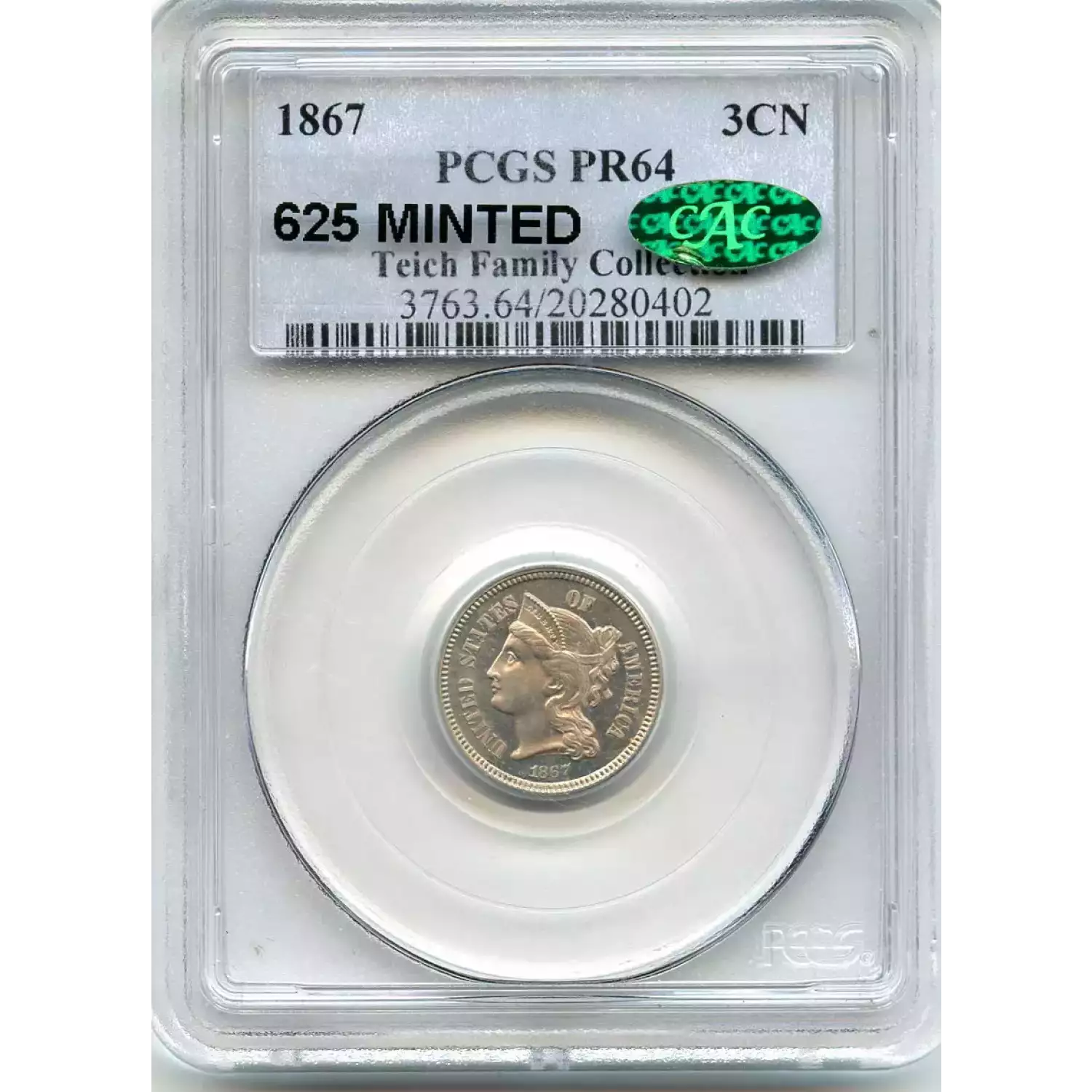 512986 | 1867-PR-64 Three Cent Pieces (Nickel) PCGS PR-64 CAC | PCGS | PR-64 | Sold: 17/05/2019 | $400 |