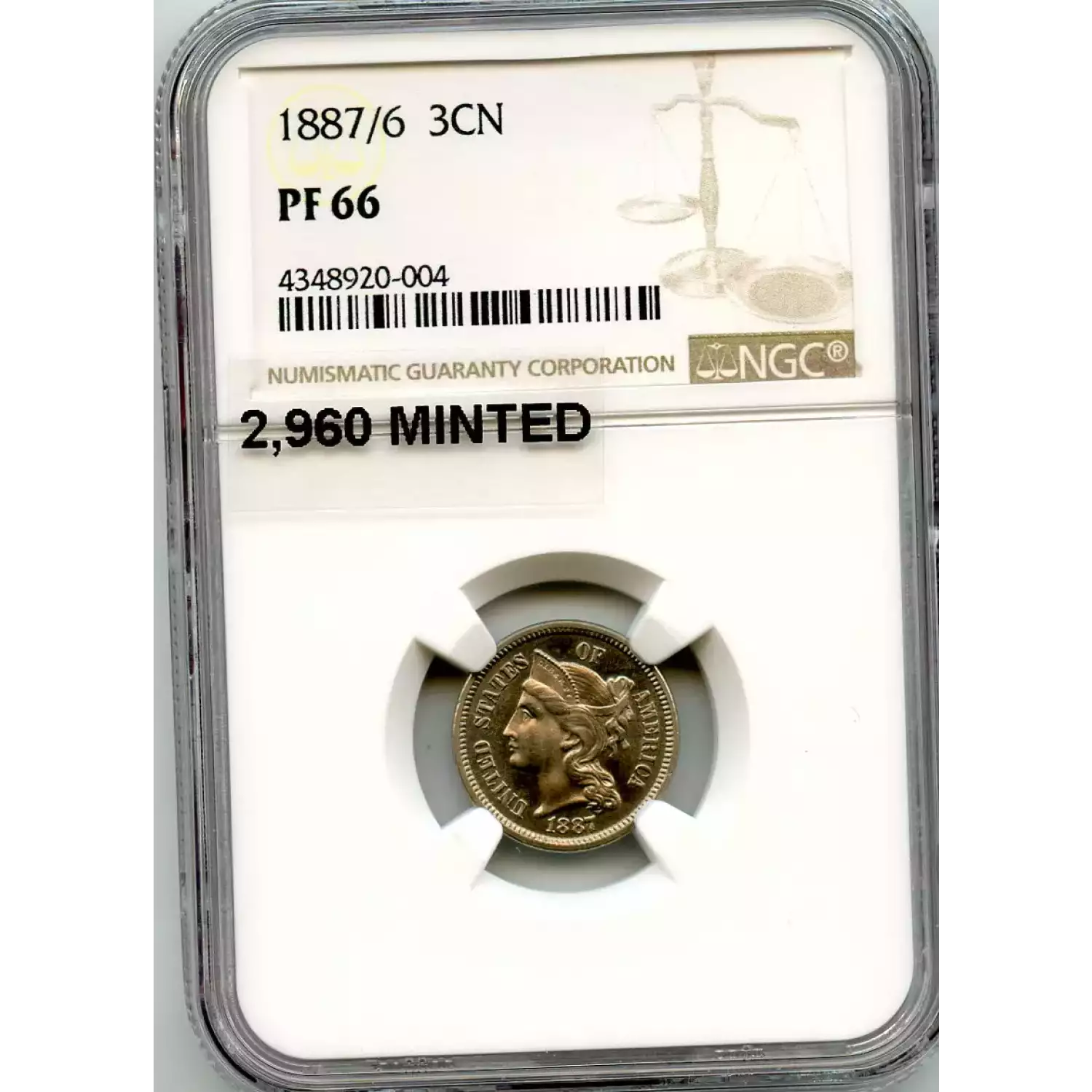512184 | 1887/6-PR-66 Three Cent Pieces (Nickel) NGC PR-66 | NGC | PR-66 | Sold: 20/01/2020 | $750 |