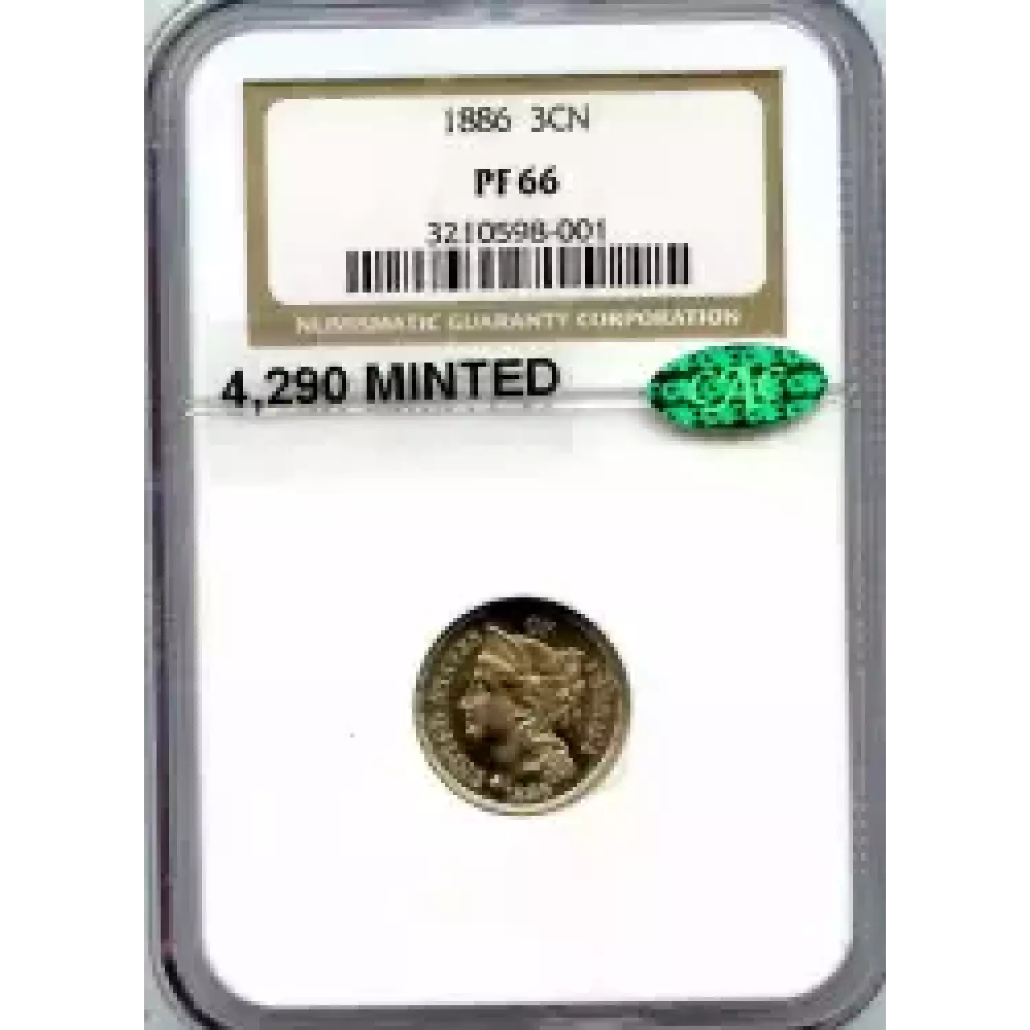 510927 | 1886-PF-66 Three Cent Pieces (Nickel) NGC PF-66 CAC | NGC | PF-66 | Sold: 26/08/2019 | $460 |