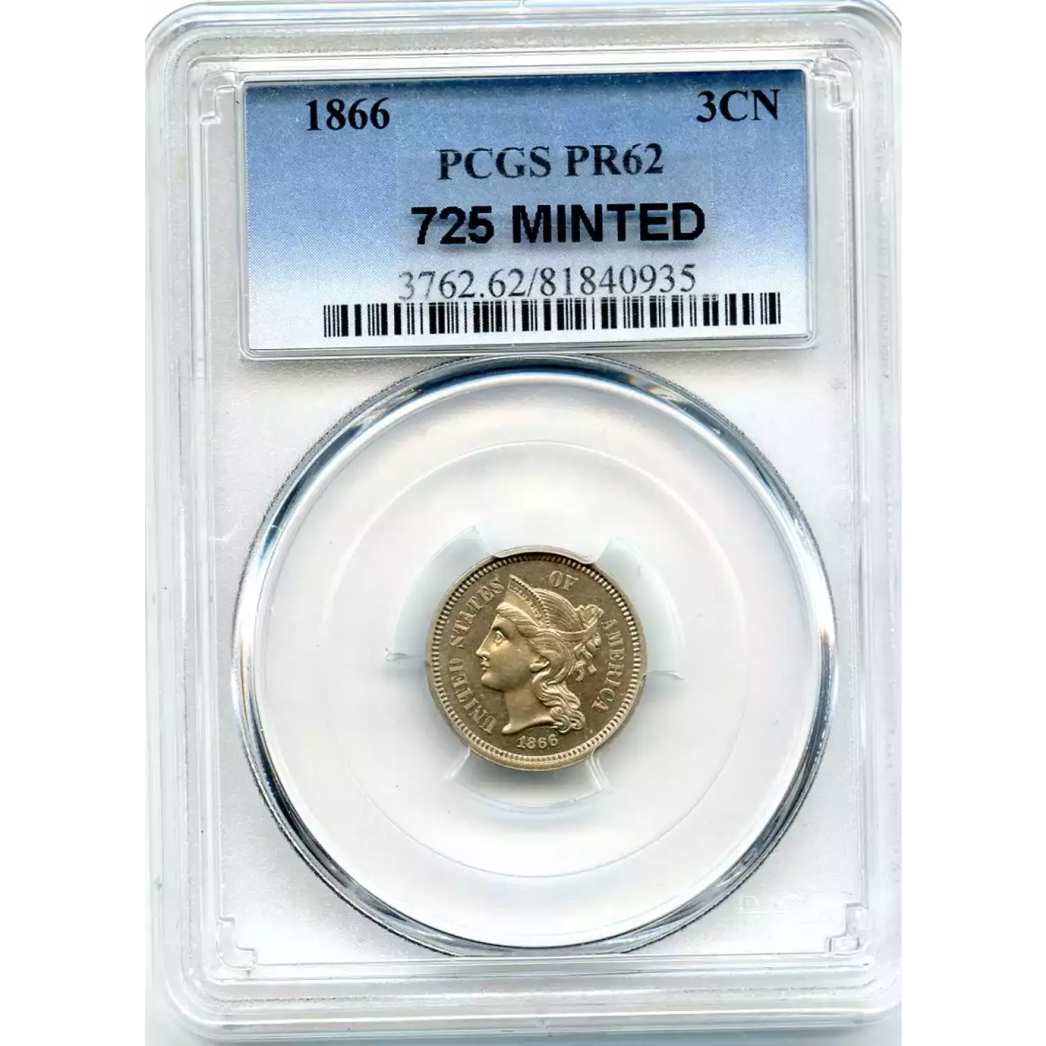 512974 | 1866-PR-62 Three Cent Pieces (Nickel) PCGS PR-62 | PCGS | PR-62 | Sold: 20/05/2019 | $275 |