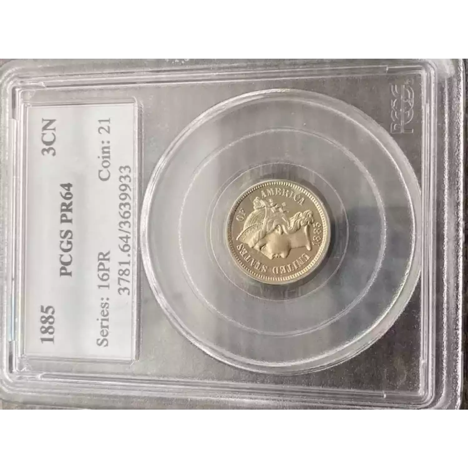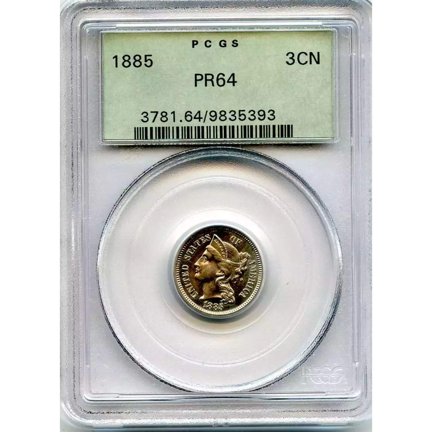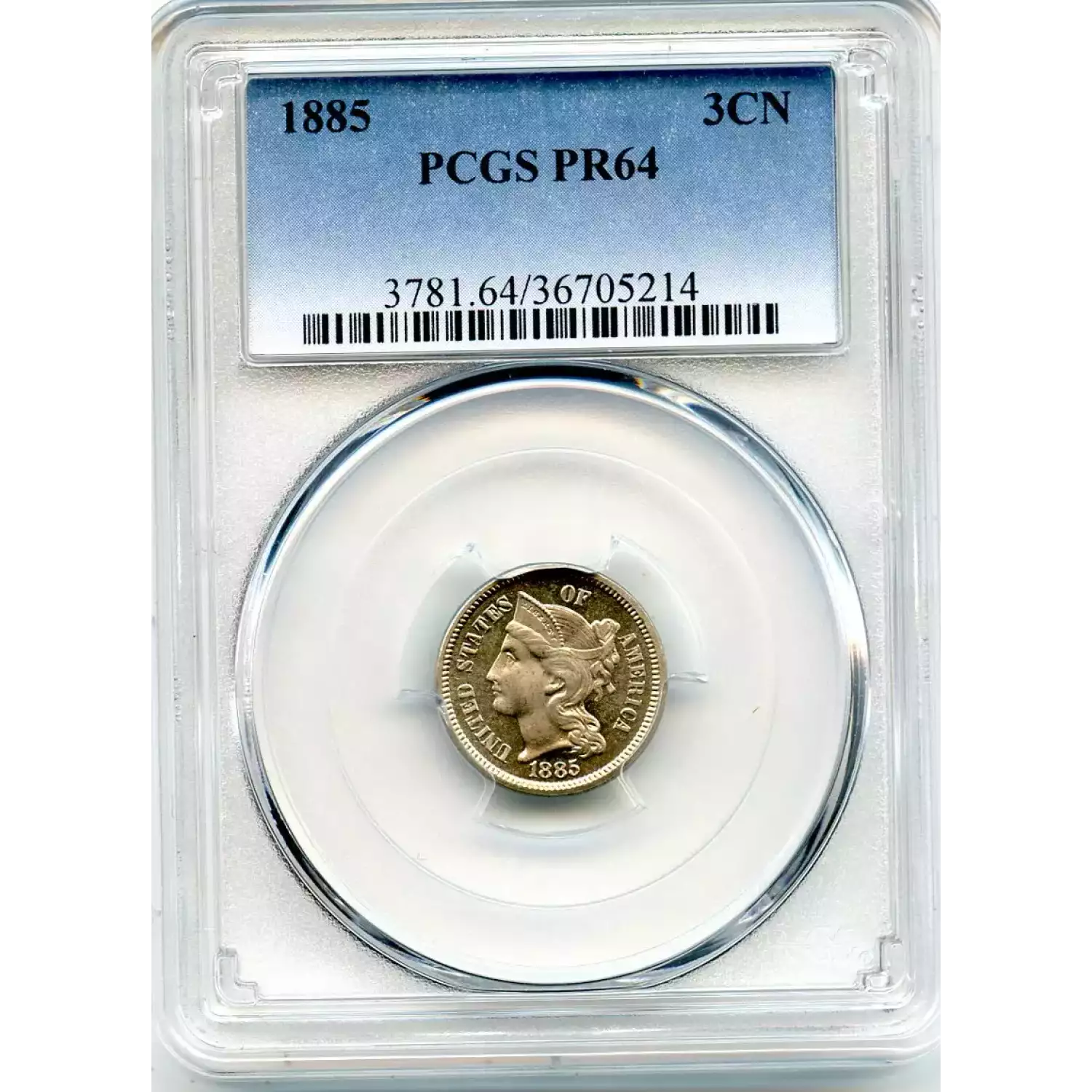 513090 | 1885-PR-64 Three Cent Pieces (Nickel) PCGS PR-64 | PCGS | PR-64 | Sold: 07/06/2019 | $500 |