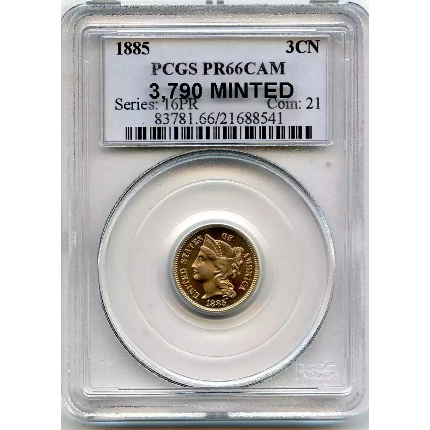 513119 | 1885-PR-66 Three Cent Pieces (Nickel) PCGS PR-66 CAM | PCGS | PR-66 | Sold: 15/07/2019 | $900 |