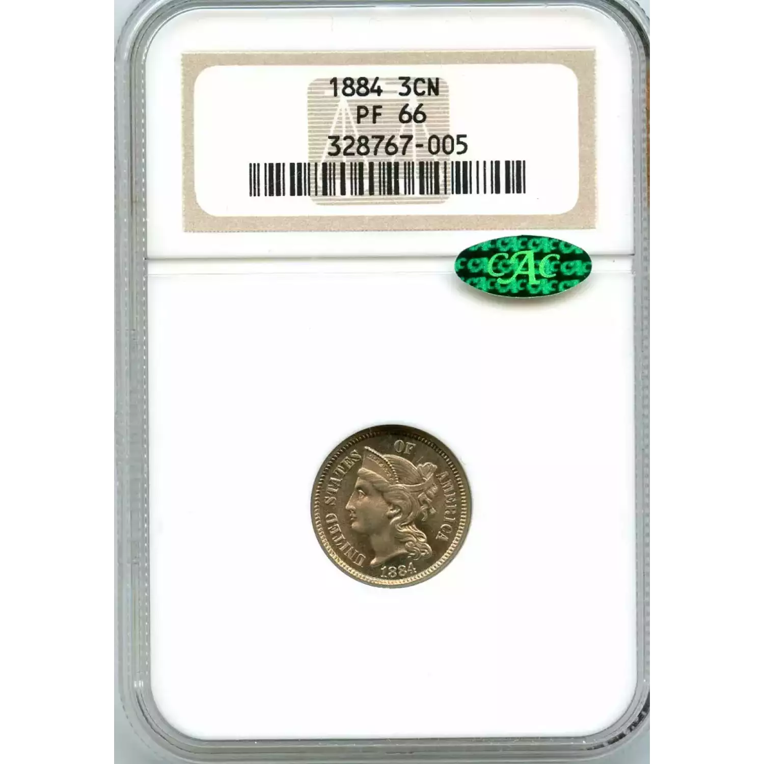 513265 | 1884-PR-66 Three Cent Pieces (Nickel) NGC PR-66 CAC | NGC | PR-66 | Sold: 23/11/2019 | $675 |