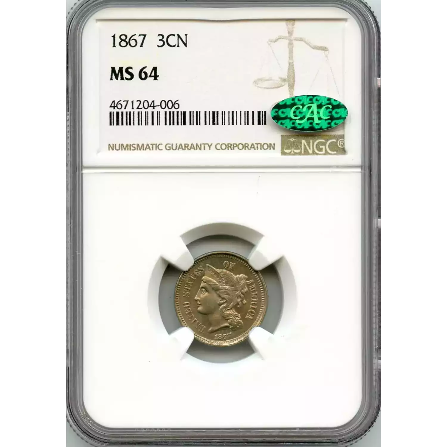 513666 | 1867-MS-64 Three Cent Pieces (Nickel) NGC MS-64 CAC | NGC | MS-64 | Sold: 06/10/2020 | $300 |