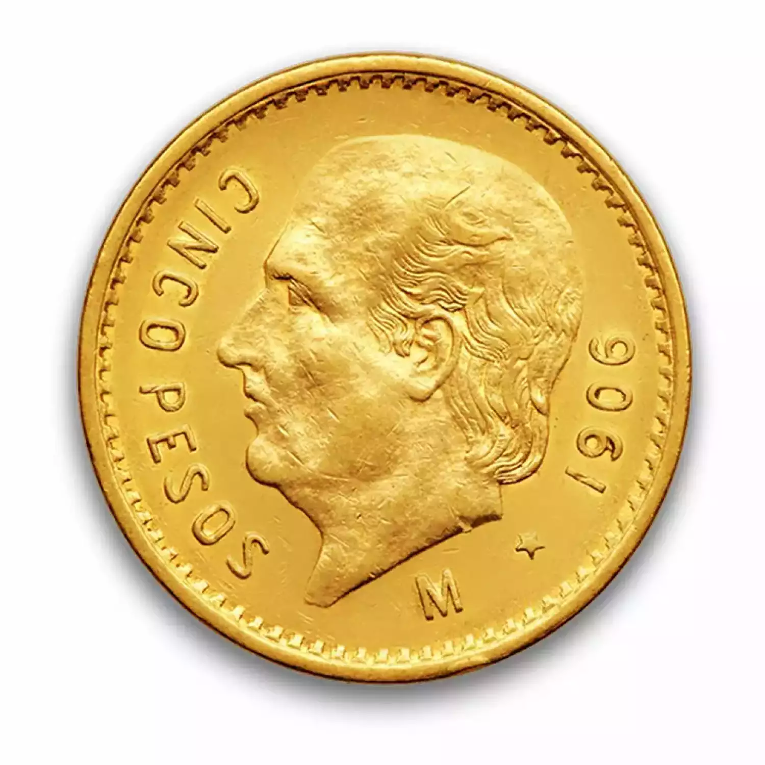 The Peso is an iconic piece of Mexico's currency. Mexico Peso Gold Coins are available in 6 different denominations- 2 Gold Pesos, 2 1/2 Gold Pesos, 5 Gold Pesos, 10 Gold Pesos, 20 Gold Pesos, and 50 Gold Pesos. Mexico 5 Peso Gold Coins are produced by the Mexican Mint.
