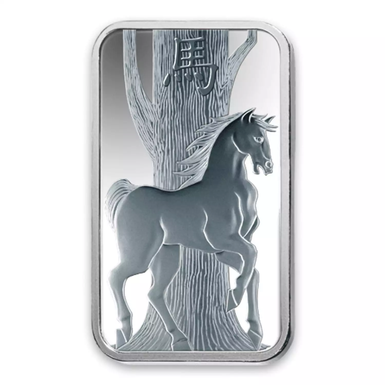 The 10g PAMP Silver Bar - Lunar Horse is manufactured in Switzerland and is composed of 10 grams of .999 pure silver. This beautiful silver bar features a horse design for the Chinese Zodiac series on the obverse.