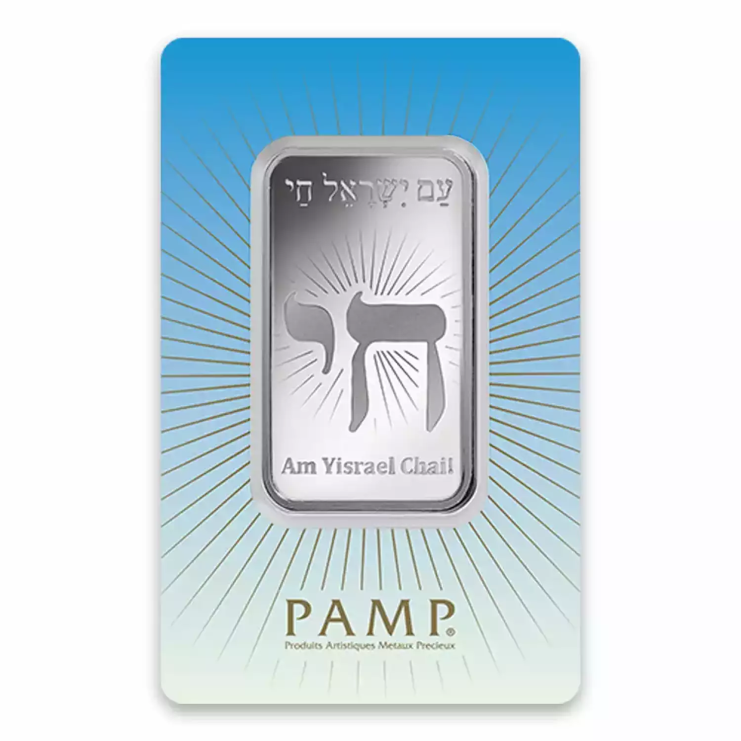 Each 1oz PAMP Silver Bar - Am Yisrael Chai! is composed of 1 troy ounce of .999 fine silver. The most popular sizes when you buy silver are 1oz, 10oz, and 100oz. Many other sizes exist but those silver bar or silver round sizes are not as popular.
