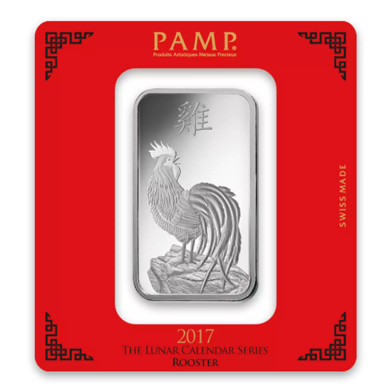 Each 100g PAMP Silver Bar - Lunar Rooster contains 100 grams of .999 pure silver. The obverse of the silver bar features the image of a rooster proudly looking over its right shoulder. Above the image, the Chinese symbol for rooster is stamped.