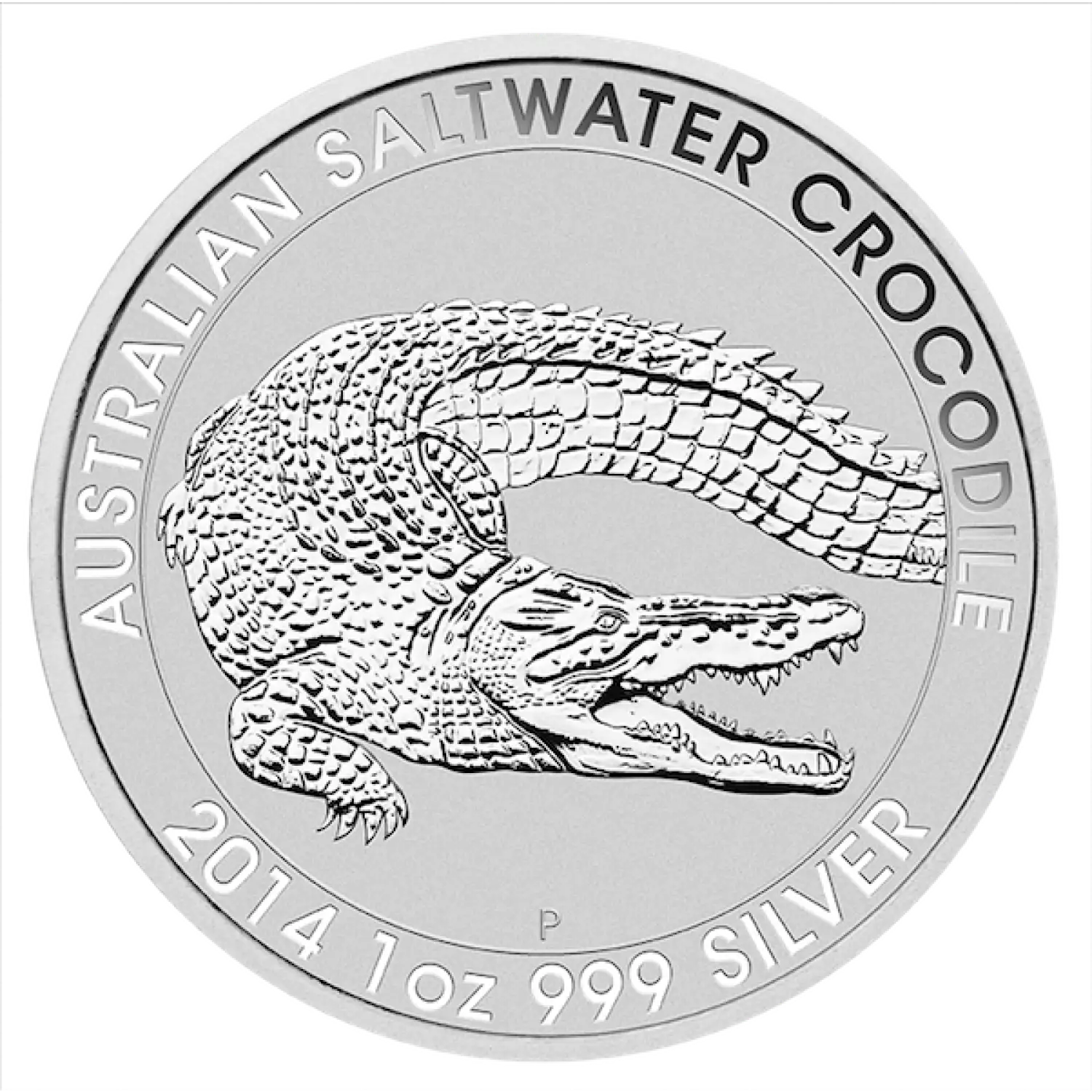 Each 2014 1oz Perth Mint Silver Saltwater Crocodile is made with 1 troy ounce of .999 pure silver. The reverse of the coin features a large saltwater crocodile with its mouth open, displaying its sharp teeth. The most popular sizes when you buy silver are 1oz, 10oz, and 100oz. Many other sizes exist but those silver bar, silver coin or silver round sizes are not as popular.