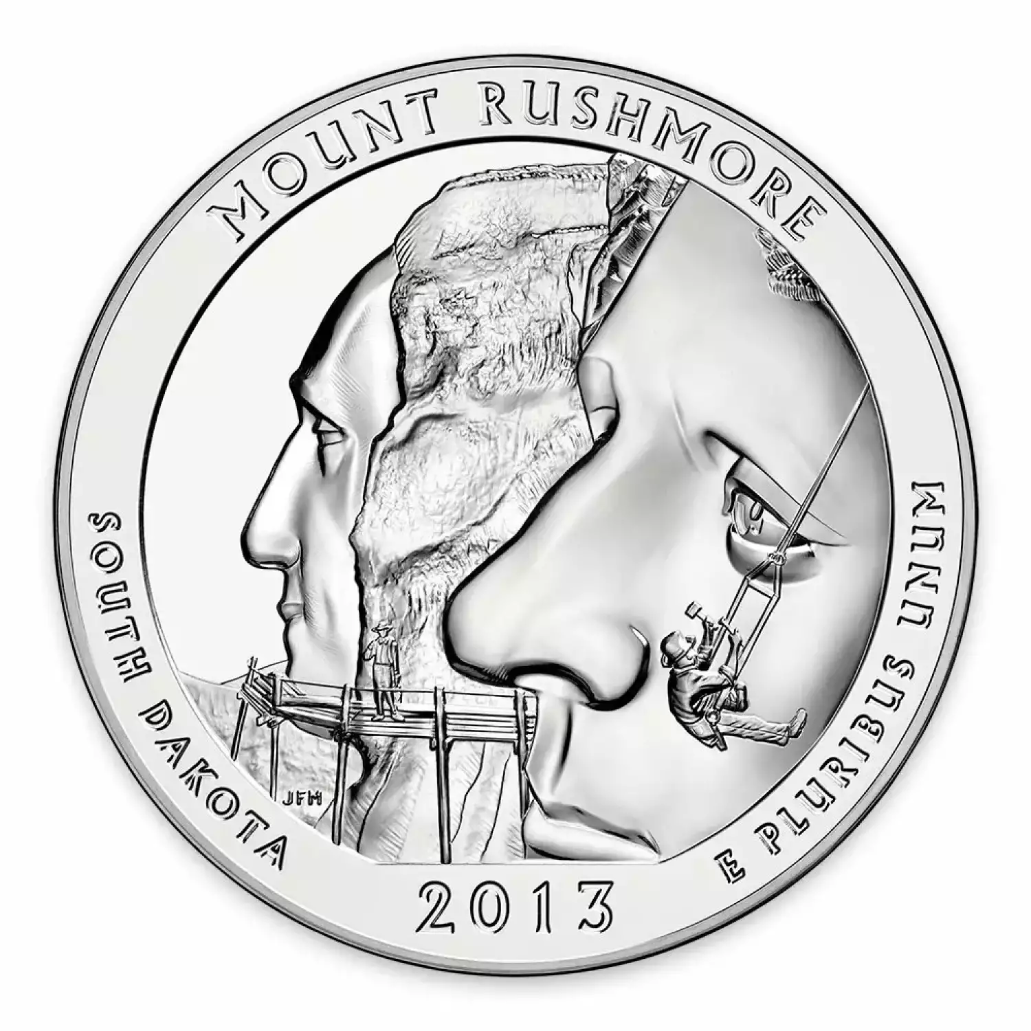 Since 2010, the US Mint released five silver America the Beautiful coins annually. The 5oz silver coins will be complete in 2021, each representing a historical monument or a treasured national park. These bullion coins were introduced following the success of the state quarter program.Mount Rushmore National Memorial is centered around a sculpture carved into the granite face of Mount Rushmore in the Black Hills in Keystone, South Dakota. Sculptor Gutzon Borglum created the sculpture's design and oversaw the project's execution from 1927 to 1941 with the help of his son Lincoln Borglum.