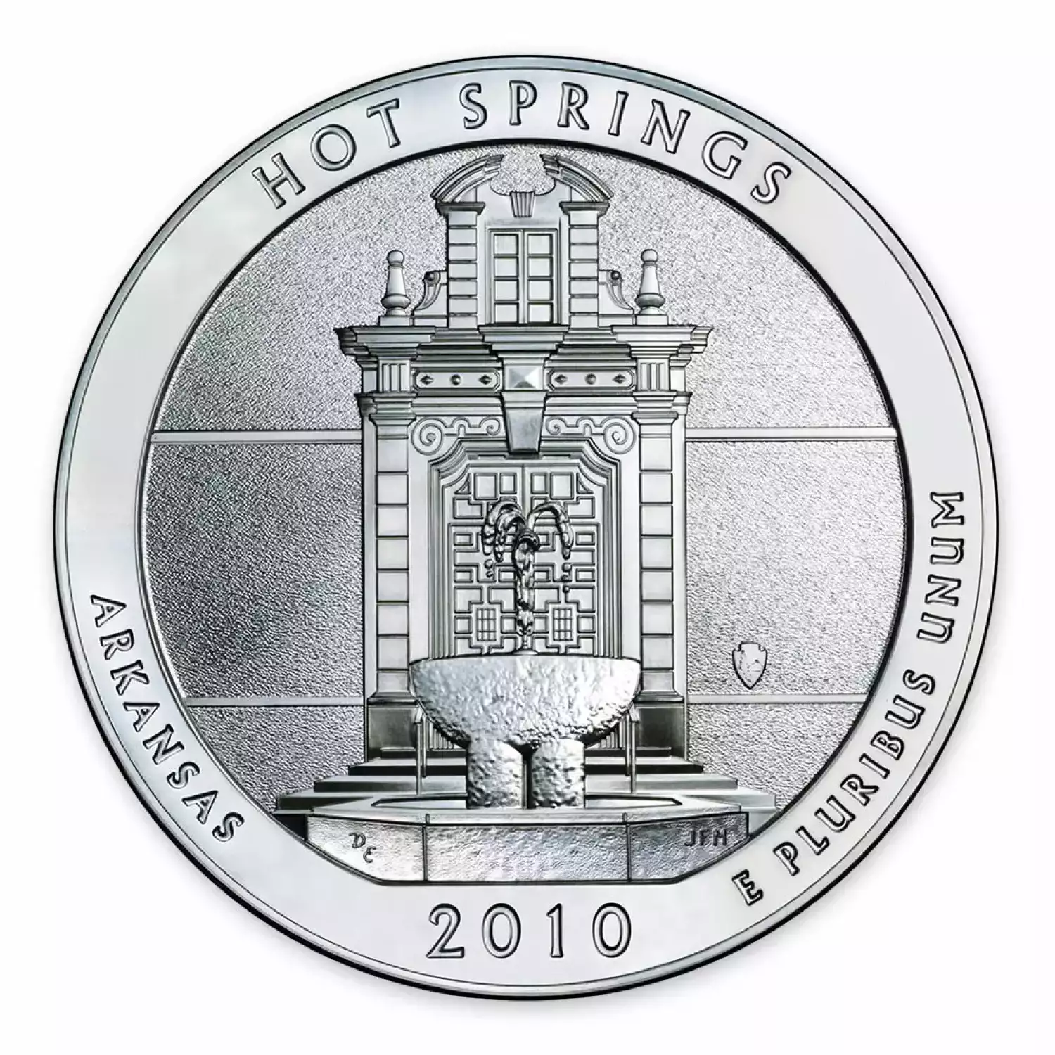 Since 2010, the US Mint released five silver America the Beautiful coins annually. The 5oz silver coins will be complete in 2021, each representing a historical monument or a treasured national park. These bullion coins were introduced following the success of the state quarter program.Hot Springs National Park is an American national park in central Garland County, Arkansas, adjacent to the city of Hot Springs, the county seat. Hot Springs Reservation was initially created by an act of the United States Congress on April 20, 1832 to be preserved for future recreation.
