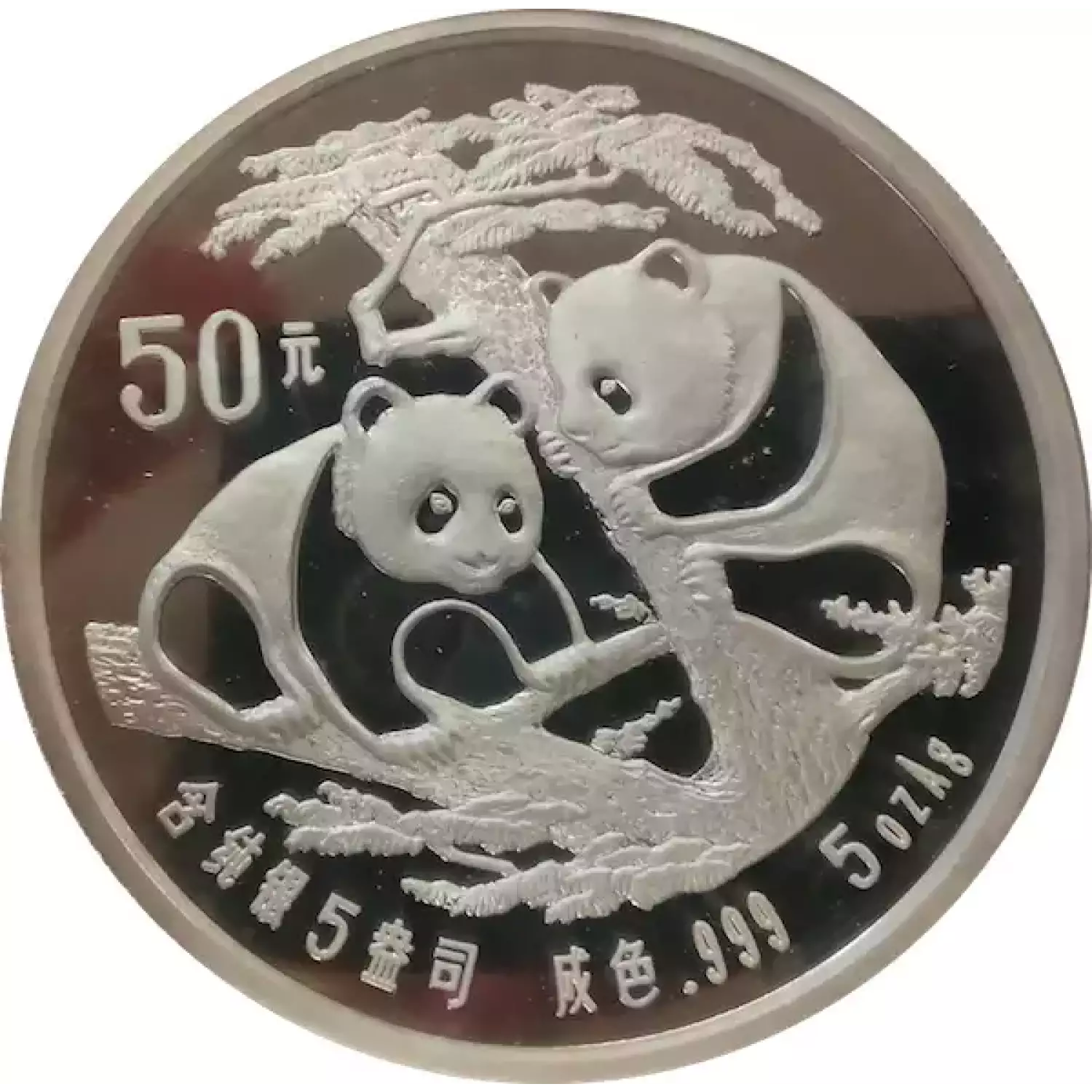 The Chinese Silver Panda Coins are one of the diverse, most popular silver bullion coins in the world. Silver Pandas have been produced since 1983, and have been minted in different denominations of 1/20 oz, 1/10 oz, 1/4 oz, 1/2 oz, and 1 oz. The 1988 5 oz Chinese Silver Panda is composed of 5 troy ounces of .999 fine silver and has a face value of 50 Yuan. The Reverse of the coin features two playful pandas in a tree.