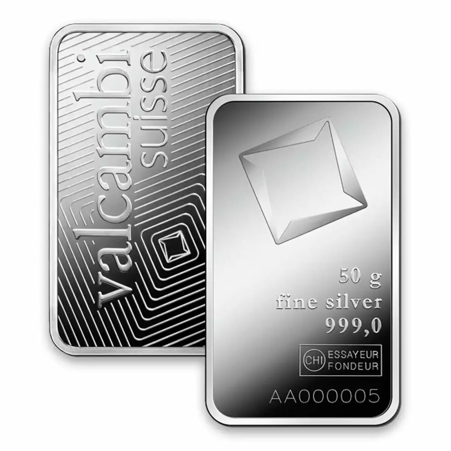 Valcambi Suisse is one of the oldest Swiss refineries, popular for minting high-quality bars. The 50g Valcambi Minted Silver Bar contains 50 grams of .999 pure silver, featuring the Valcambi corporate logo. This strikingly beautiful silver bar is designed by Valcambi Suisse.