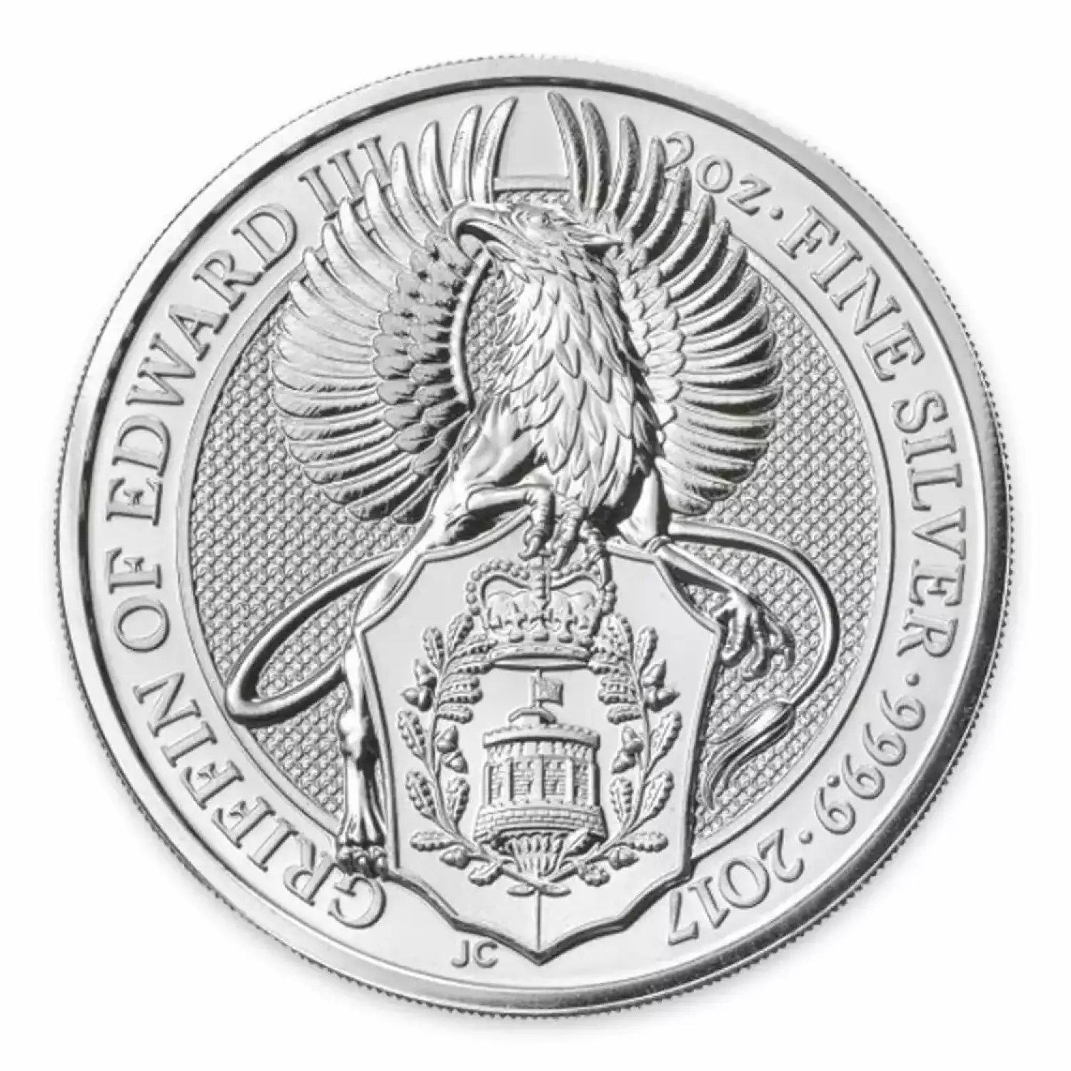 The Queen's Beast Griffin is the second in the newly released Queen's Beast Series, a series that features the heraldic beasts that stood guard at The Queen's coronation. Struck by the Royal Mint, the 2 oz 2017 Britain Queen's Beasts: The Griffin is composed of 2 Troy oz of .999 pure silver. The British Queen’s Beasts coins are one of the more popular silver coins among silver bullion collectors and are made to a purity of 9999, meaning the purity is guaranteed to be a minimum of 99.99% silver.