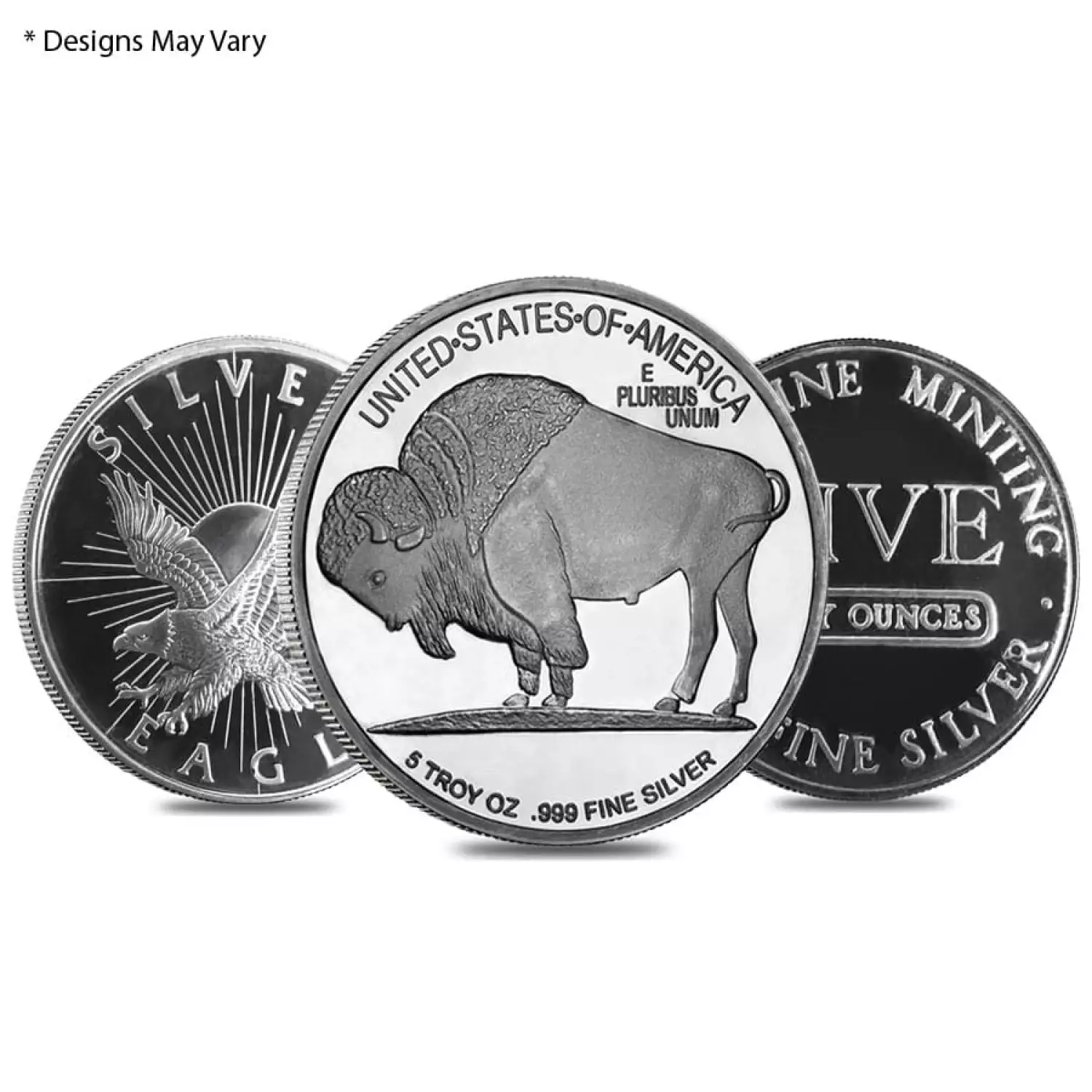 The spot price of silver tends to be more volatile than the spot price of gold and is one of the reasons that both silver premiums and spreads tend to be wider for silver coins and silver bars. Each 5 oz Generic Silver Round is composed of 5 troy ouncesof .999 fine silver.