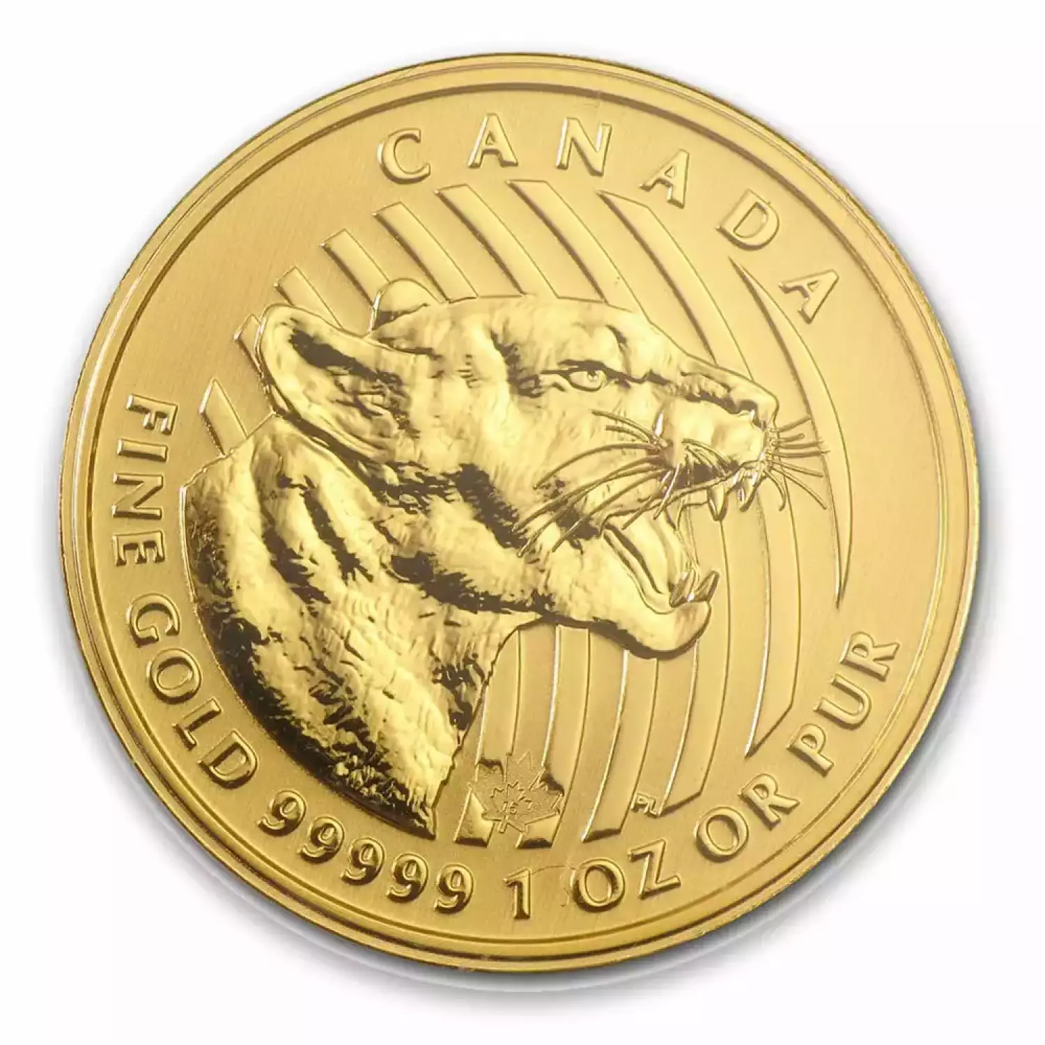 Struck in .99999 fine gold, the 1 oz Canadian Growling Cougar is one of the purest gold coins ever manufactured. This 2015 Canadian gold coin is a worldwide hallmark of exceptional artisanship and purity. The .99999 means that the Royal Canadian Mint guarantees the purity is a minimum of 99.999% gold. The 2015 1 oz Canadian Growling Cougar has a mintage of only 2,000 coins. This growling cougar coin is a cherished piece in anyone's portfolio and is highly popular among investors and collectors.