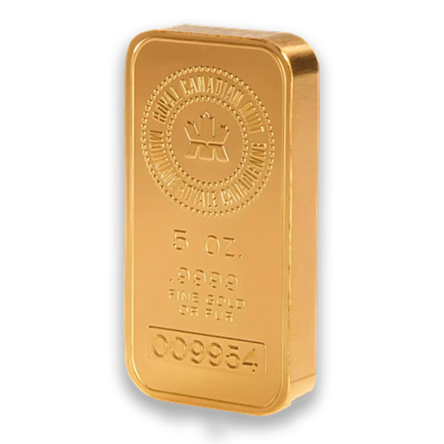 The 5 oz RCM Gold Bar is designed by the well-known Royal Canadian Mint. This .9999 fine Gold bullion bar is a popular choice among investors and collectors. Each 5 oz Royal Canadian Mint bar contains 5 troy ounces of .9999 fine gold.