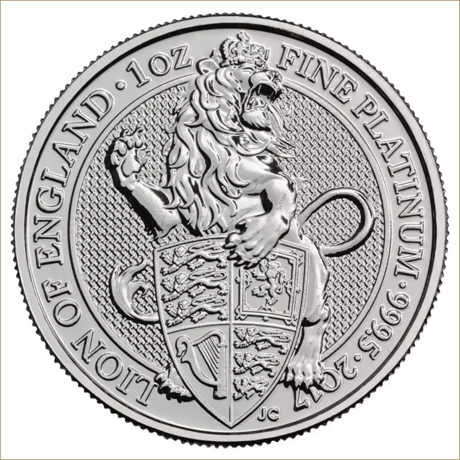 2017 - The Royal Mint 1oz Queen's Beast Platinum Coin - The Lion is the first ever platinum 1 oz coin minted by the Royal Mint. The obverse of the coin displays the effigy of her Majesty Queen Elizabeth II. The reverse depicts a majestic lion, metal weight, purity and year.