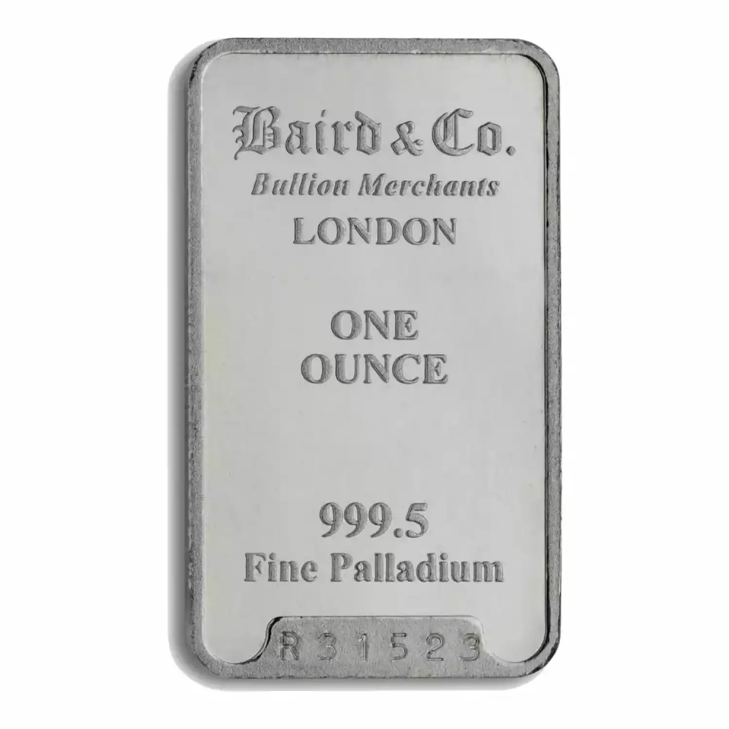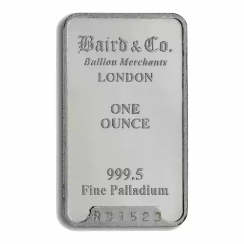 Baird & Co. is a United Kingdom mint producing palladium bars since 1967. Bullion bars come in three different types i.e. cast, minted or extruded. Each 1 oz Baird & Co Palladium Minted Bar contains 1 troy ounce of .9995 fine palladium.