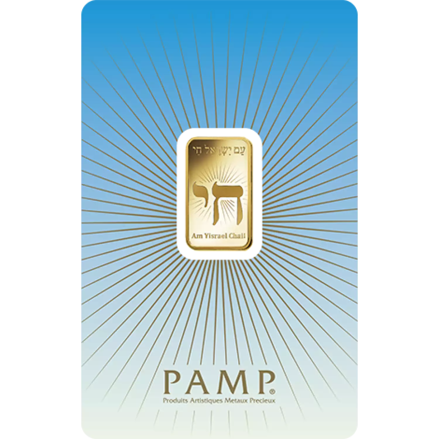 PAMP is the world-renowned producer of precious metals bars. The PAMP Gold Bars have been accepted as a great delivery by the Swiss National bank since 1986. The 5g PAMP Gold Bar - Am Yisrael Chai! is manufactured in Switzerland and is composed of 5 grams of 999.9% fine gold.