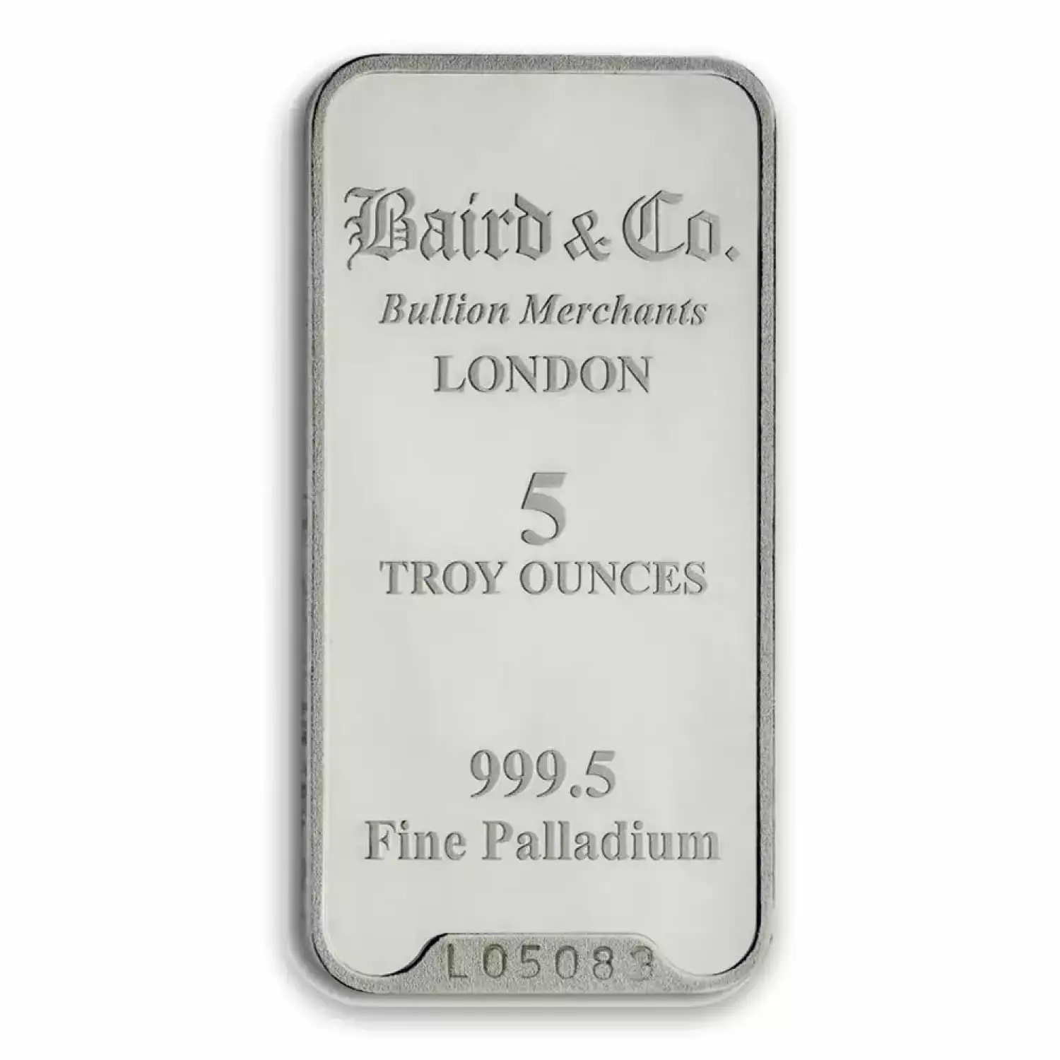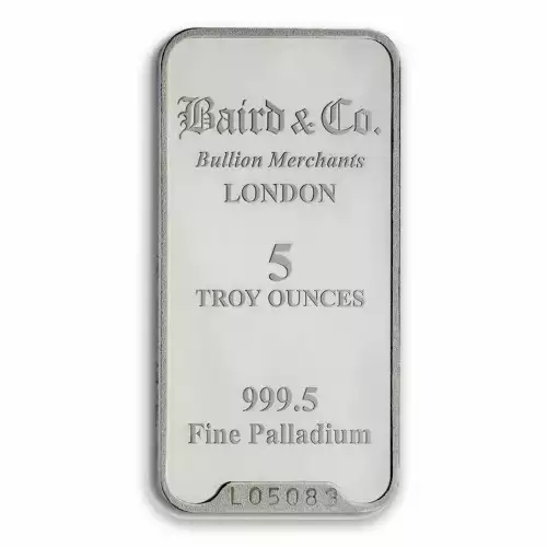 Baird & Co. is a United Kingdom mint producing palladium bars since 1967. Bullion bars come in three different types i.e. cast, minted or extruded. Each 5 oz Baird & Co Palladium Minted Bar contains 5 troy ounces of .9995 fine palladium.