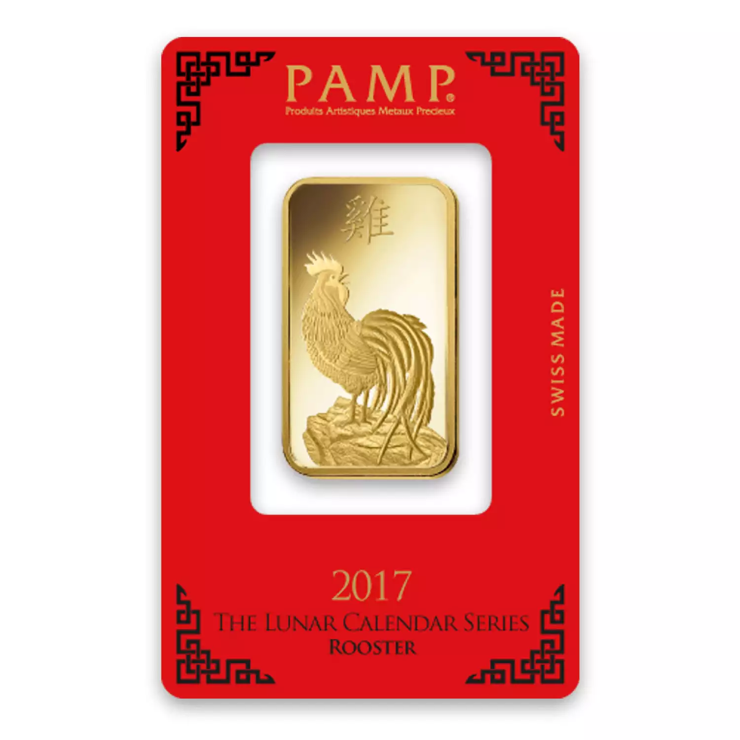 2017 is the Year of the Rooster on the Chinese Lunar Calendar. The 1 oz PAMP Gold Bar - Lunar Rooster features the image of a rooster proudly looking over its right shoulder on its obverse. Above the image, the Chinese symbol for rooster is stamped.