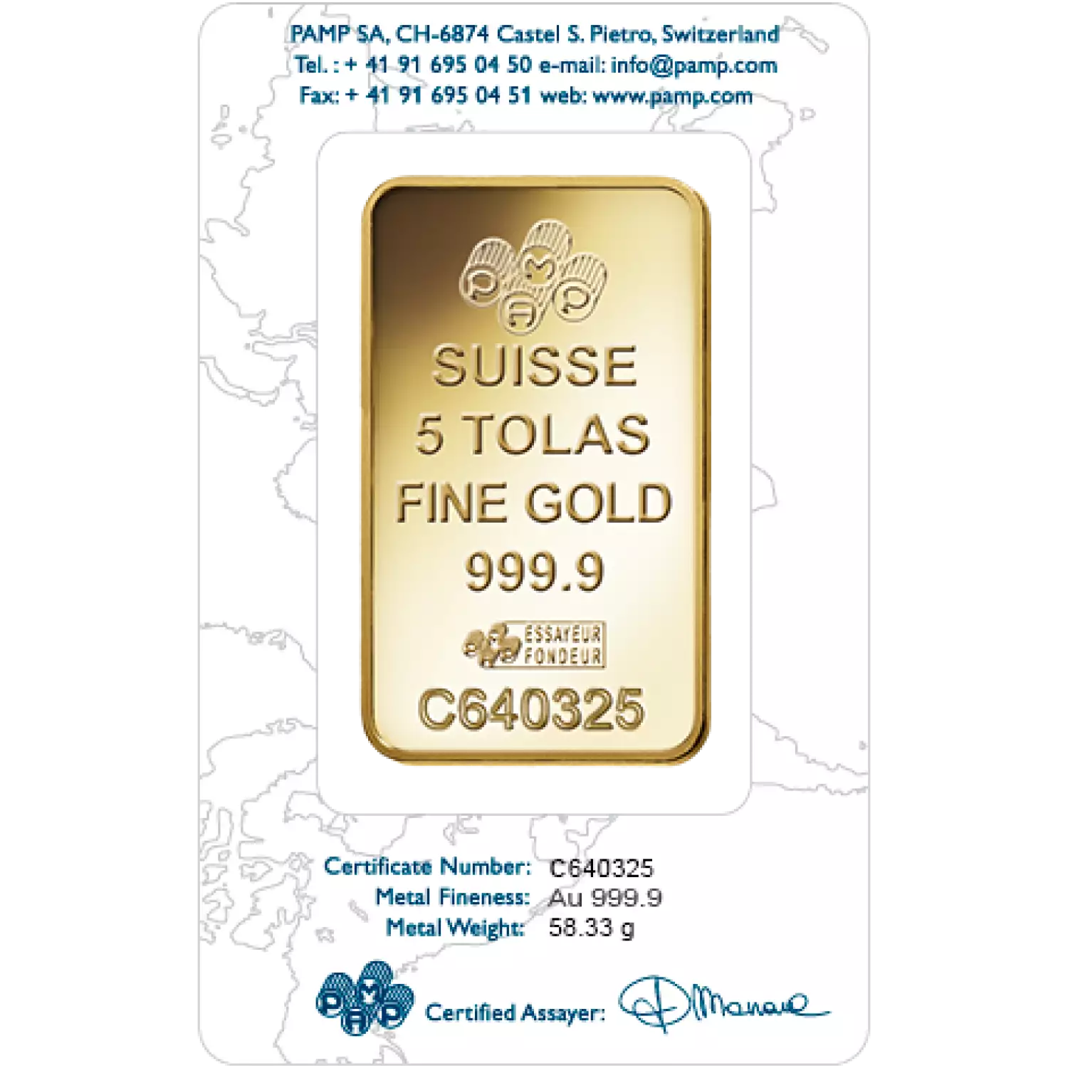 The PAMP Suisse 5 Tola gold bar is more commonly found in Asian markets and tyically is most commonly found in India, but can be purchased worldwide. The tola is an ancient unit of measure for precious metals and 5 Tolas is equal to 1.875 troy ounces.