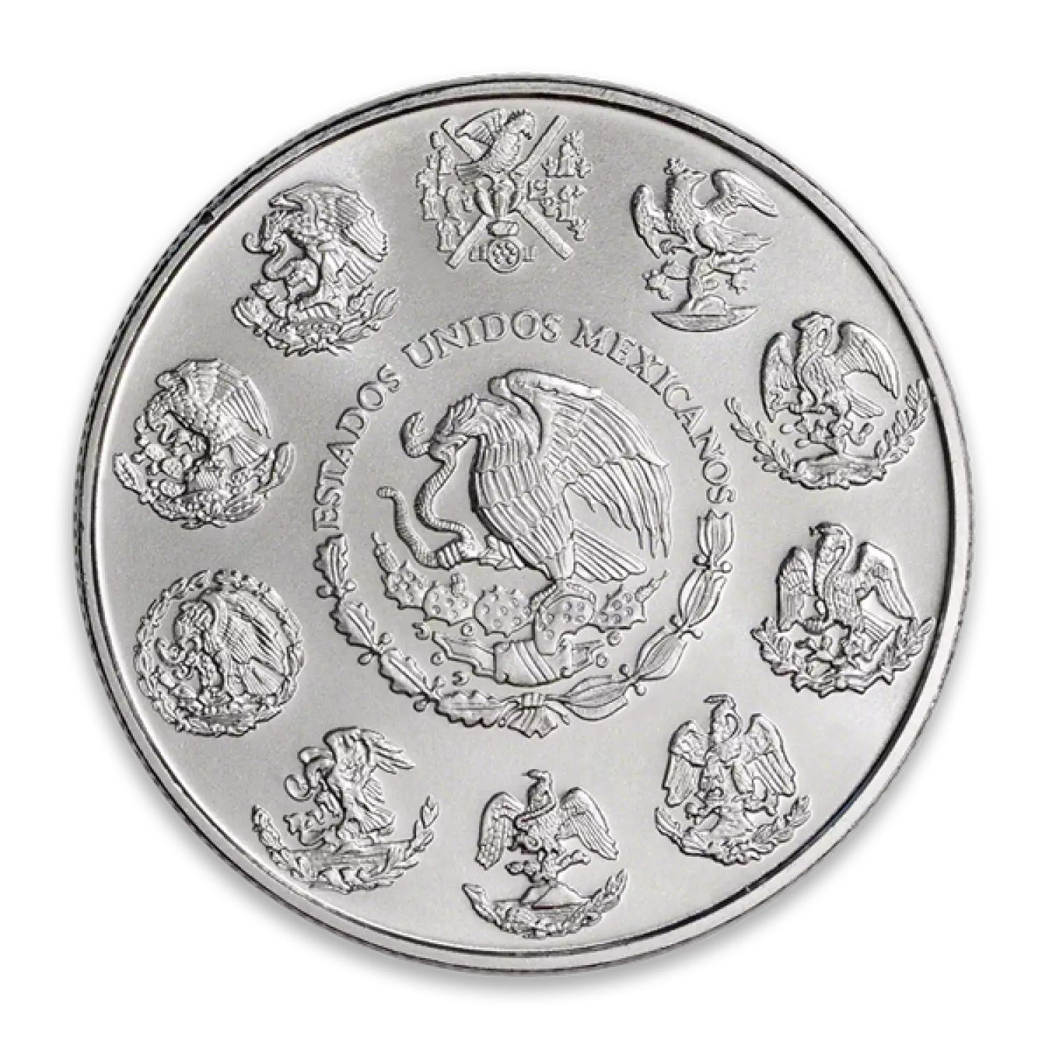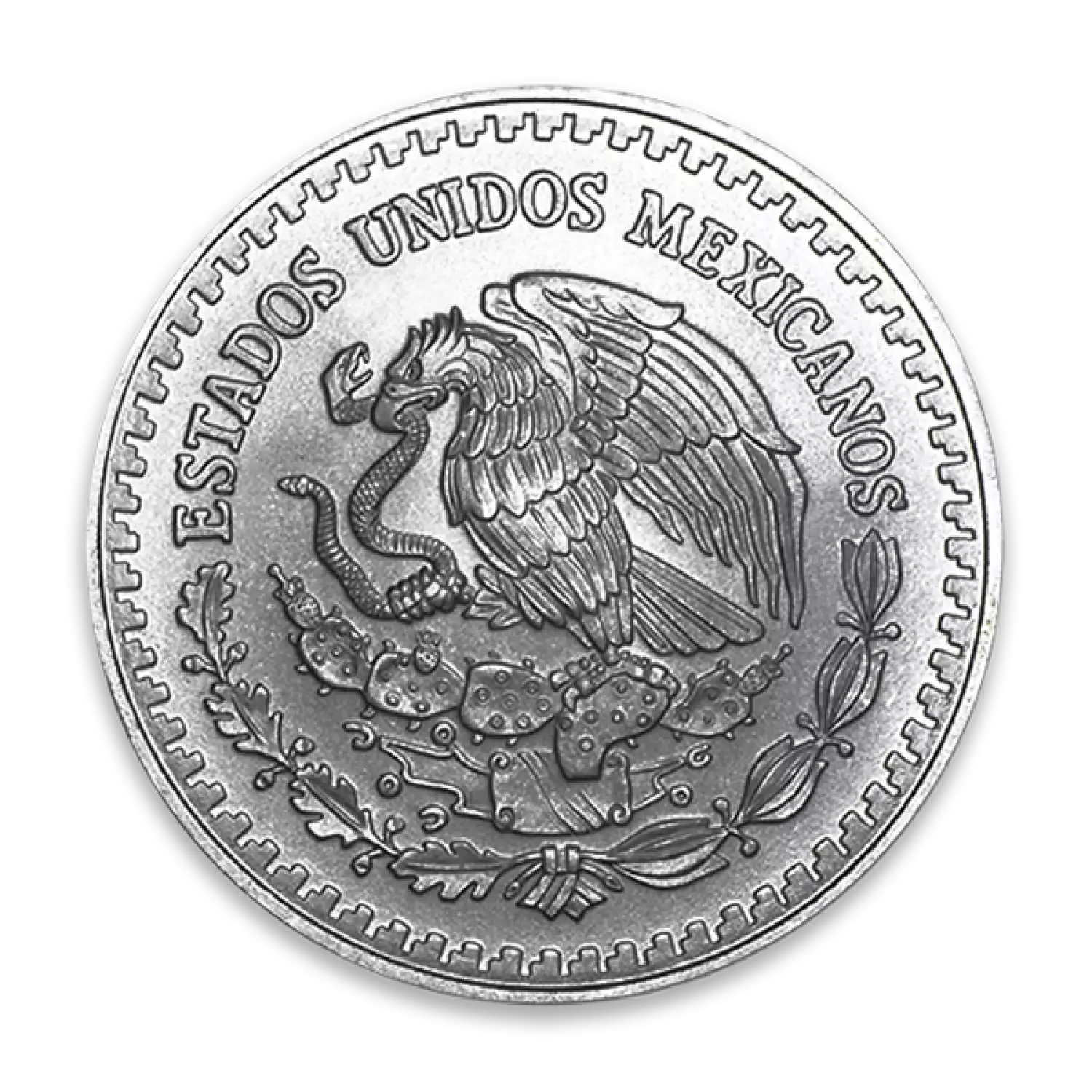 A winged Victoria of Mexican Independence Victory Column in front of a landscape with the volcanoes Popocat’petl and Iztaccihuatl graces the front, while the reverse contains the coat of arms of Mexico surrounded by historical mexican coats of arms. The Mexican Libertad design has changed over the years. Some investors refer to this Mexican silver coin as the Mexican Onza while others call it the Mexican Libertad. They are one in the same coin.