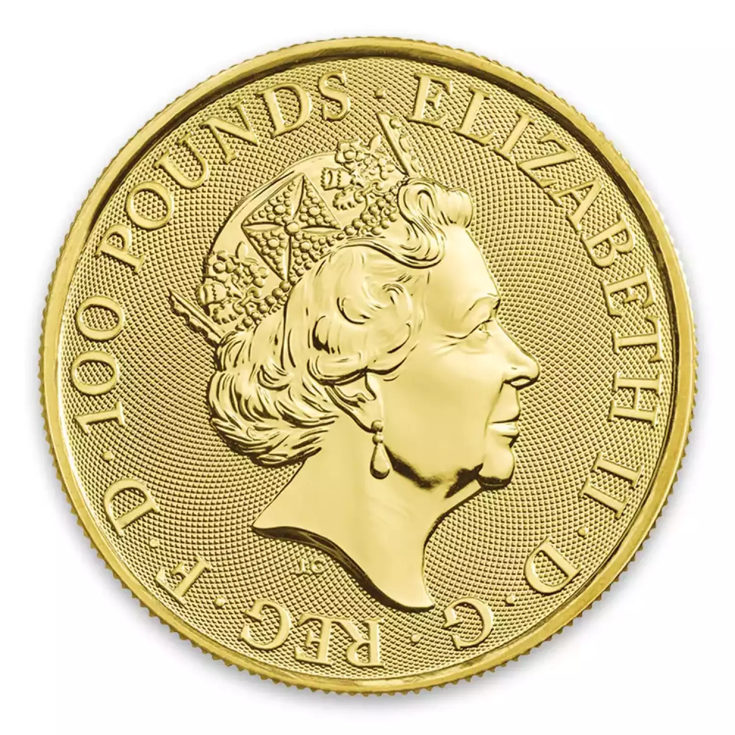 The 1 2020 Britain Queen's Beasts: The White Lion of Mortimer is the first release in an exciting new 10 coin series. The Britain Queen's Beasts celebrate the British Monarch and the centuries of fascinating heraldry. This gold coin contains 1 oz of .9999 fine Gold. The reverse, designed by Jody Clark, depicts a lion holding a shield with a rose on it, the symbol of York, along with the sun rays which symbolised good luck in the battles.