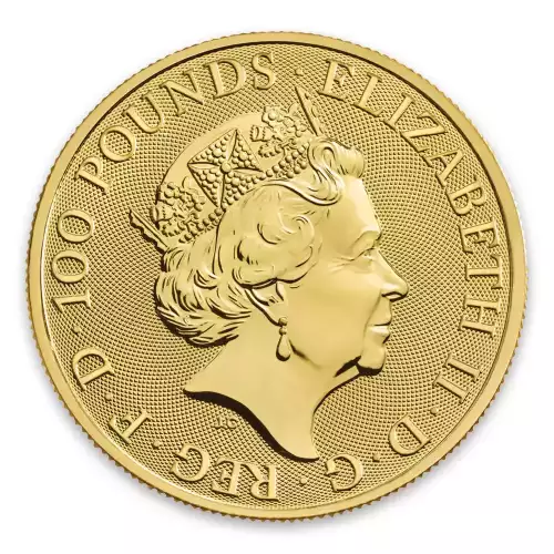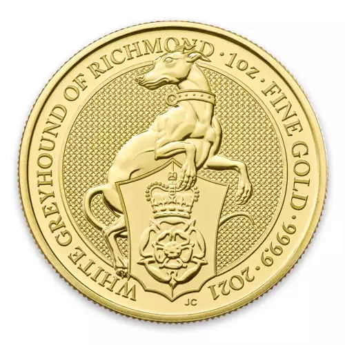 The 2021 1oz Gold Britain Queen's Beast: The White Greyhound of Richmond Coin is made of .9999 fine gold and weighs 1 Troy oz. The 2021 1oz Gold Britain Queen's Beast: The White Greyhound of Richmond, has a limited mintage and it's the eighth coin from this collection. The coin is designed by Jody Clark and while the observe depicts her Majesty, Queen Elizabeth II, the reverse is facing the White Greyhound of Richmond along with the representative seal of the Tudors.