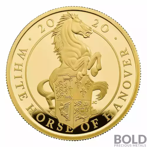 The 2021 1/4oz Britain Queen's Beasts: The White Horse of Hanover is the first release in an exciting new 10 coin series. The Britain Queen's Beasts celebrate the British Monarch and the centuries of fascinating heraldry. This gold coin contains 1/4 oz of .9999 fine Gold. The reverse, designed by Jody Clark, depicts the White Horse of Hanover along with the representative sea of the Tudors.